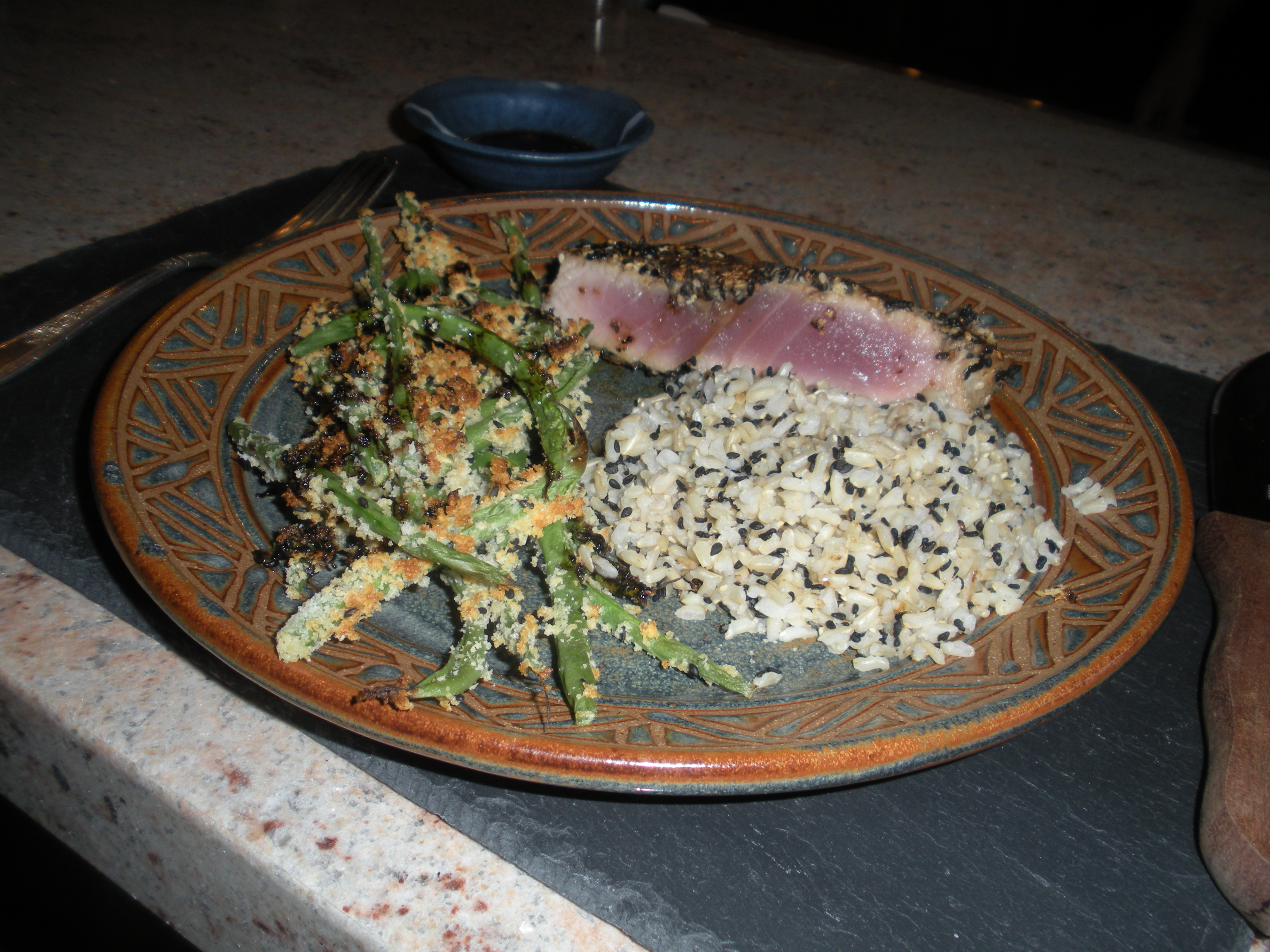 We bought some tuna at Costco. John marinated it and covered it with black and white sesame seeds. A quick sear was all it needed. I made some oven method brown rice and added some toasted black sesame seeds. I also roasted green beans in the oven with a panko bread crumb-sesame seed coating. To serve with the beans I reduced some fish sauce, balsamic vinegar and soy sauce. Everyone agreed that the dinner was a success.