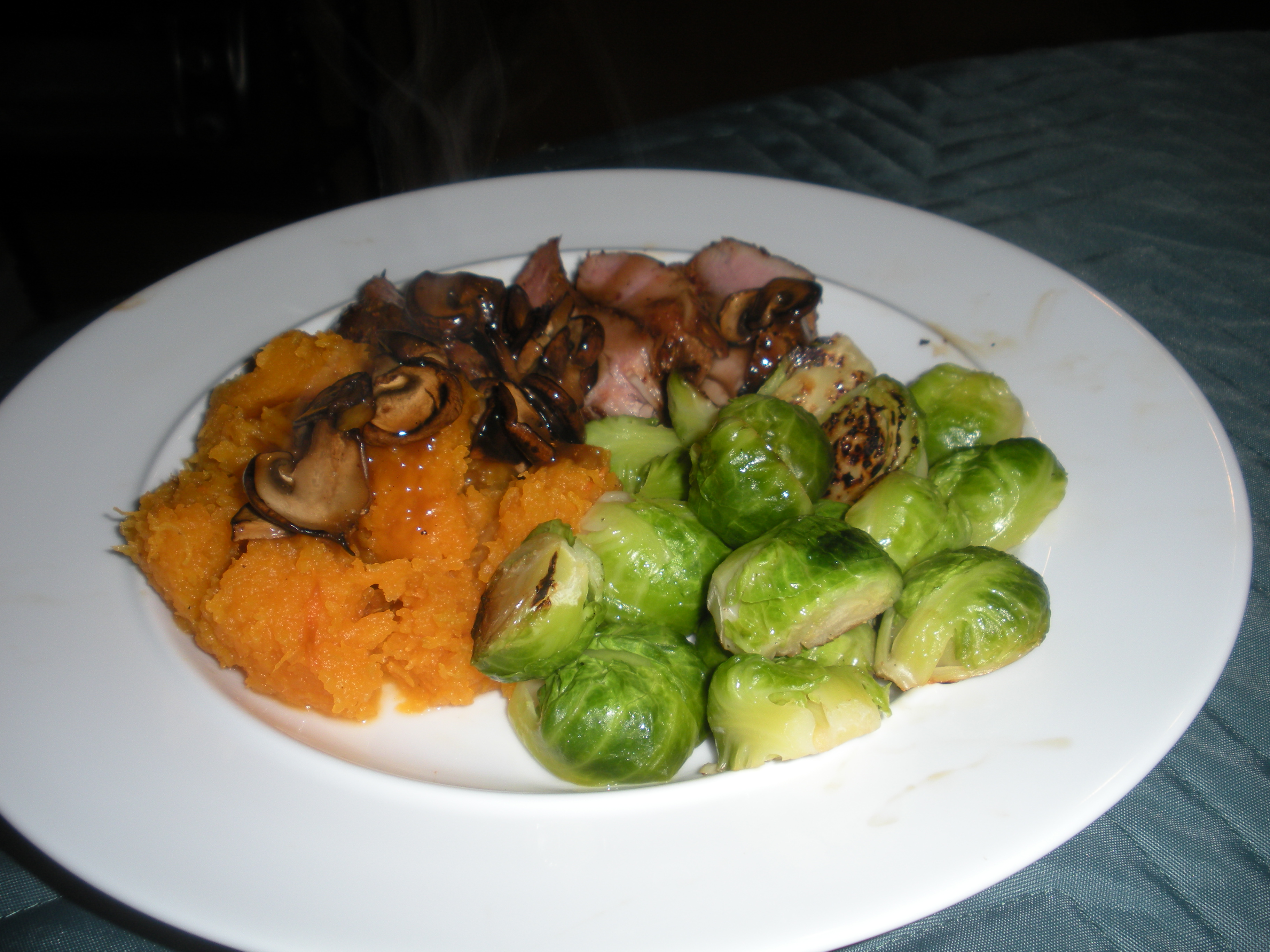 Pork tenderloin is so difficult to cook without it getting all dried out. John does a wonderful job with it, though. He tied the roast so that the thinner part overlapped and the pork was a neat, consistently thick piece of meat. Then he roasted it in a slow oven and finally seared it on a grill pan. It’s a lot of work but the meat comes out tender and moist. I roasted the butternut squash and prepared the Brussels sprouts the way we like them – with a little butter and sherry. We made a packet of gravy and put some mushrooms in it. Good dinner.