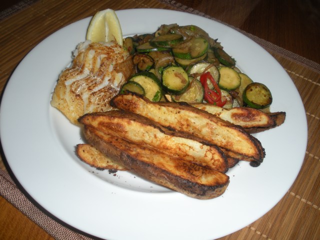 This cod turned out really well. John cooked it perfectly. I popped the olive oil sprayed potato wedges on a preheated cookie sheet in the oven and cooked them for about 15 minutes until they were crispy.