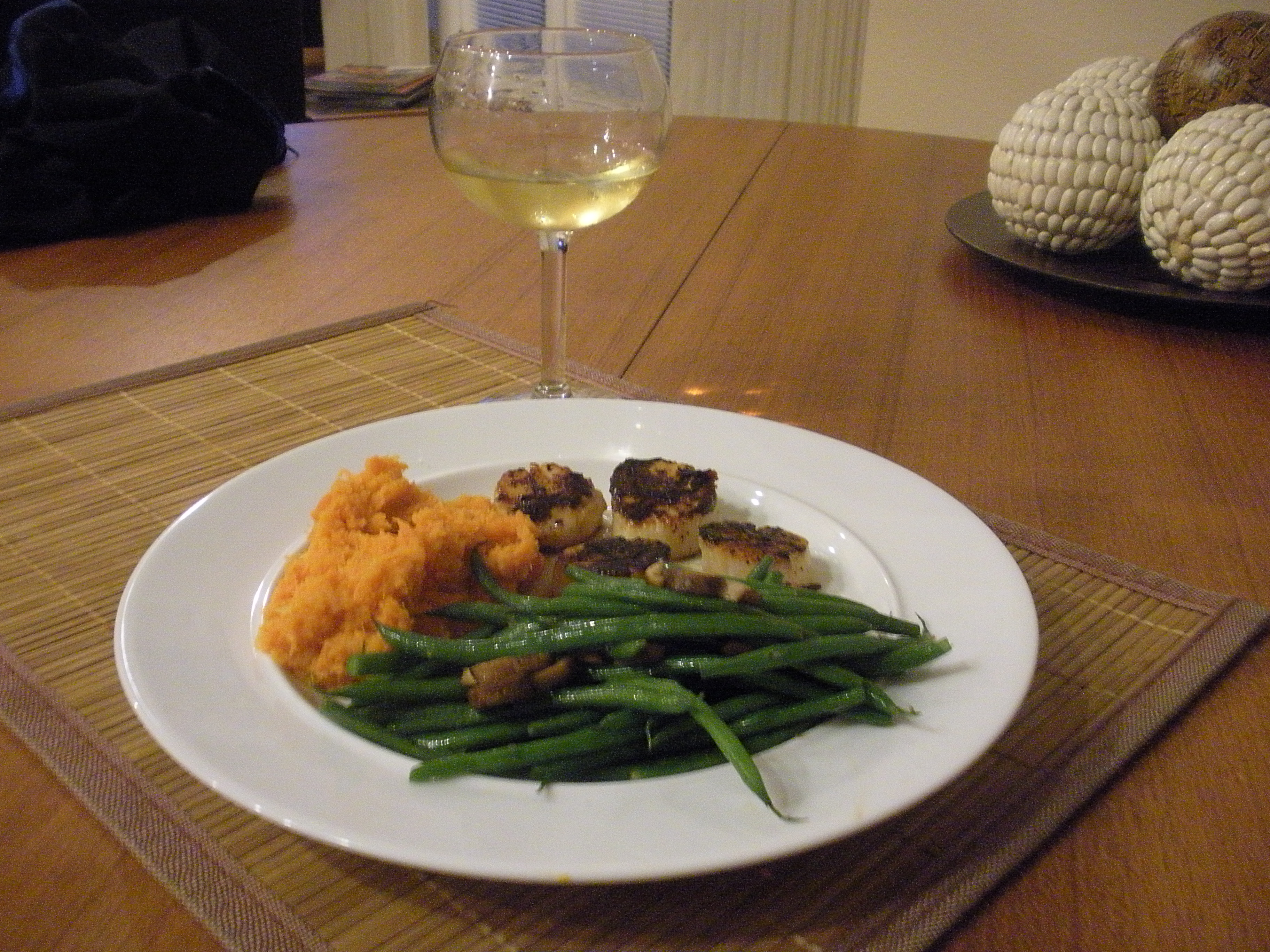 Scallops, green beans and a combo mash of sweet potatoes, butternut squash, and rutabagas made for a tasty dinner. John does such a great job at cooking the scallops!
