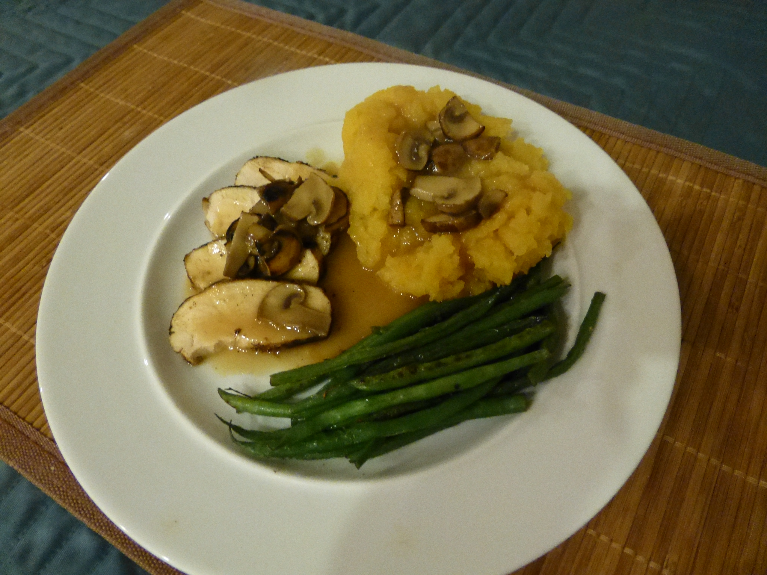 My portion is 3.5 oz. of chicken breast with chicken gravy from a packet enhanced with some mushrooms, rutabagas that I pressure cooked and mashed with a little faux butter, and little green beans cooked in a dash of water and a teaspoon of butter so they browned a bit.