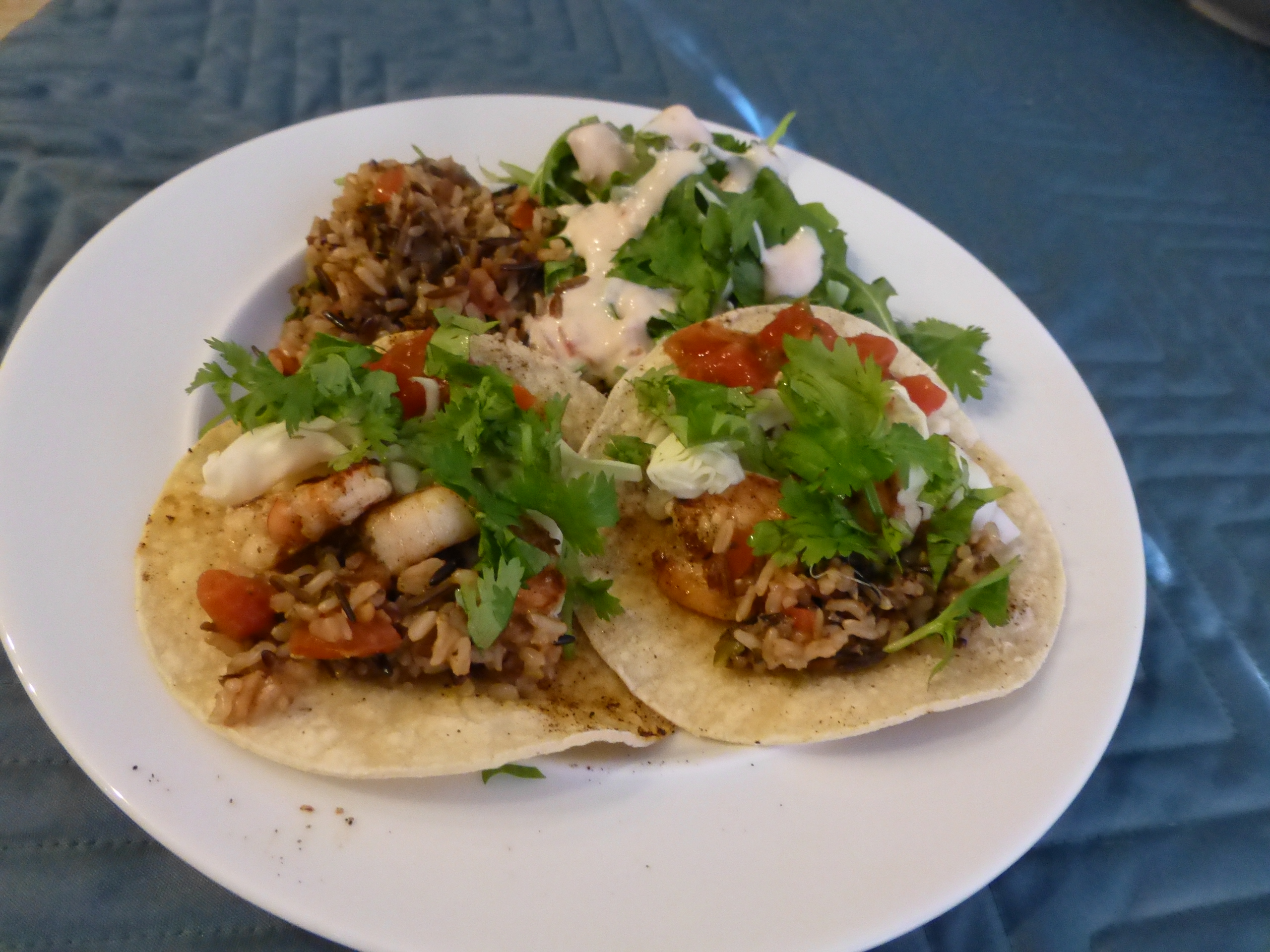 Today we made shrimp tacos. John cooked the shrimp and I prepared the sides. We had reheated rice combo that we ate with cod last week and I made an arugula and cilantro salad with a yogurt and salsa dressing.