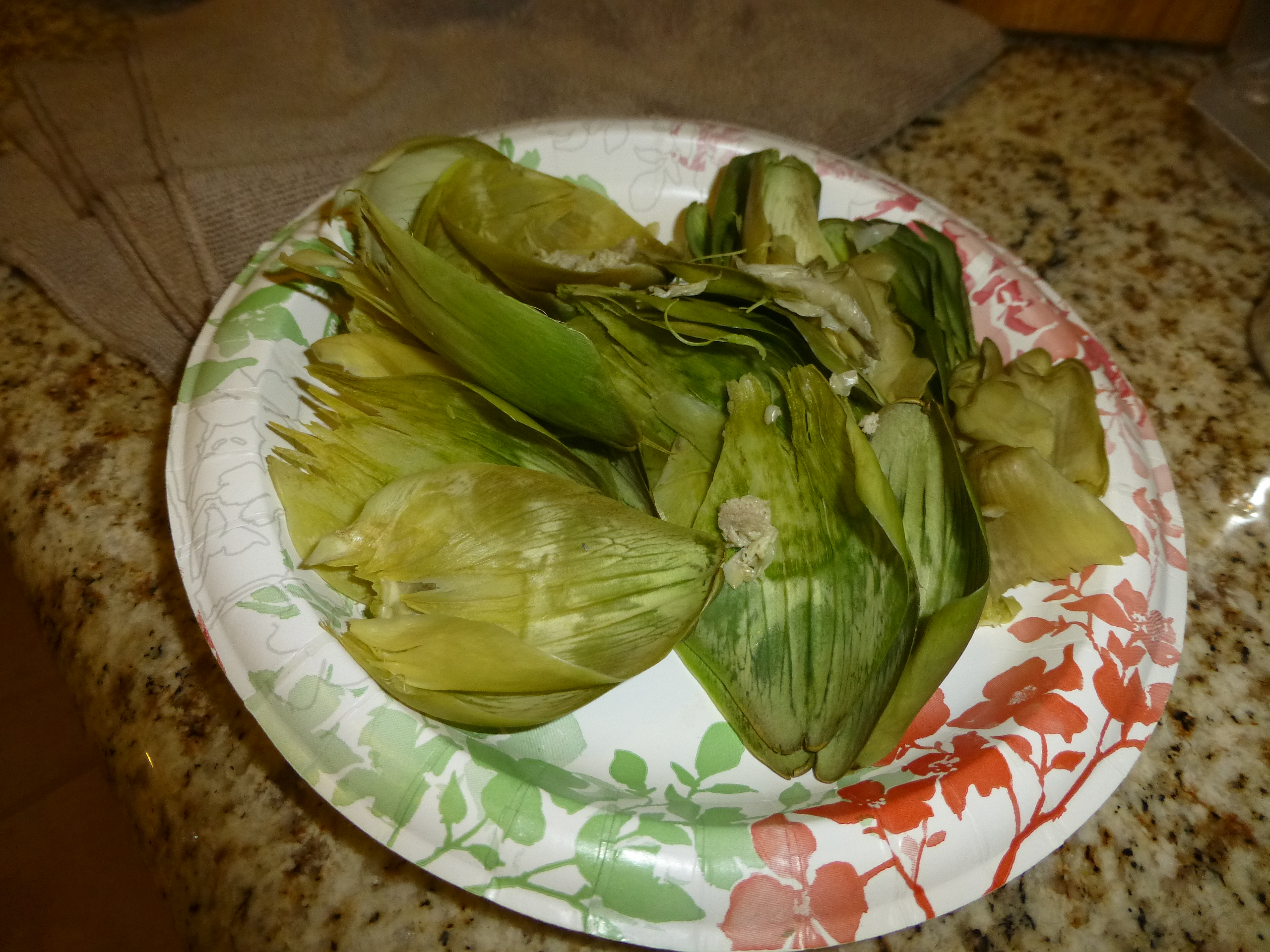 During the artichoke course, I turned on the oven and stuck in some potatoes for baking. I also put in some asparagus that cooked much more quickly than the potatoes. So, first course, asparagus.