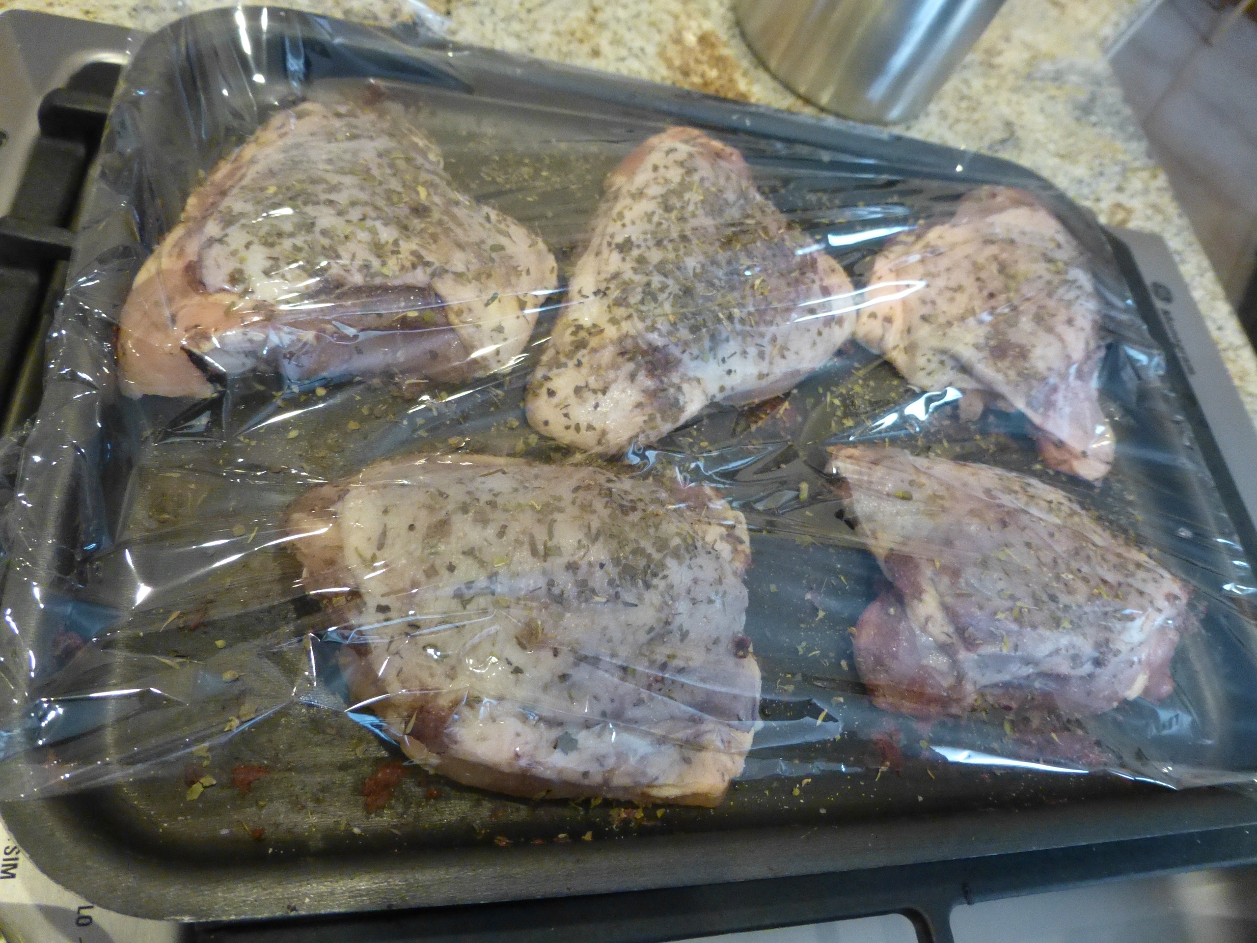 John puts the chicken on top and we roast on convect at 400 degrees for 40 minutes. We serve it with some polenta but it is just as good on pasta. We are happy with our new chicken dinner with the exception of the quality of the chicken. Surely this a problem that can be fixed.