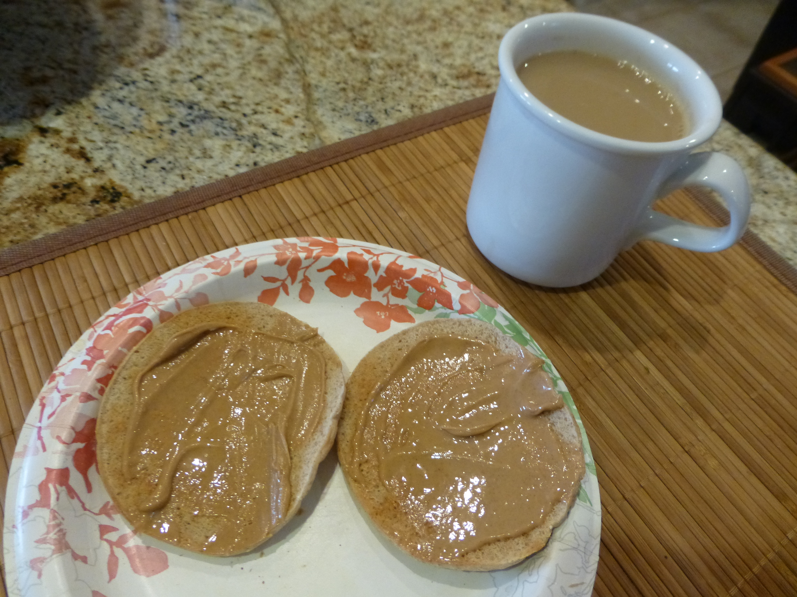 I decide to go with a toasted sandwich round and peanut butter for breakfast today. All the breakfasts I eat are about 200 calories but the PB breakfast has the most chance of creeping up. I always measure my portion carefully, scraping off the peanut butter that mounds up on my half tablespoon. I remind myself that peanut butter that sticks to the bottom of the spoon also is not mine to have. Each half of my toasted sandwich round gets a half tablespoon. Any peanut butter that is left on my half tablespoon measure is donated to John.