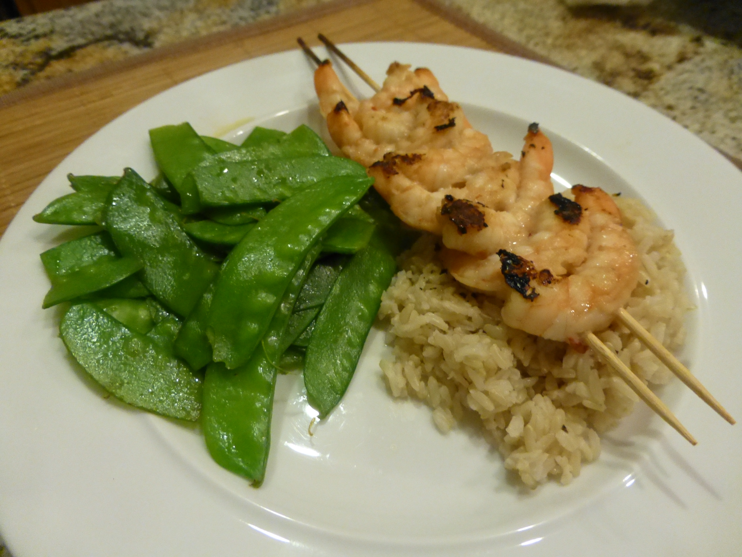 For dinner we had one of my favorite choices, shellfish. This time shrimp. I am lucky to be able to eat this since both of my sisters are allergic to shellfish. Somehow I managed to dodge that bullet. Our dinner tonight was skewered shrimp with steamed pea pods and brown rice cooked by the Cook’s Illustrated oven method (spray a 9 X 9 baking dish, add 1.5 cups rice, 2 1/3 cups of boiling water, 1 tsp. salt, cover tightly and put in a 375 degree oven for 1 hour. When done fluff, recover for 5 minutes. Perfect rice every time.)