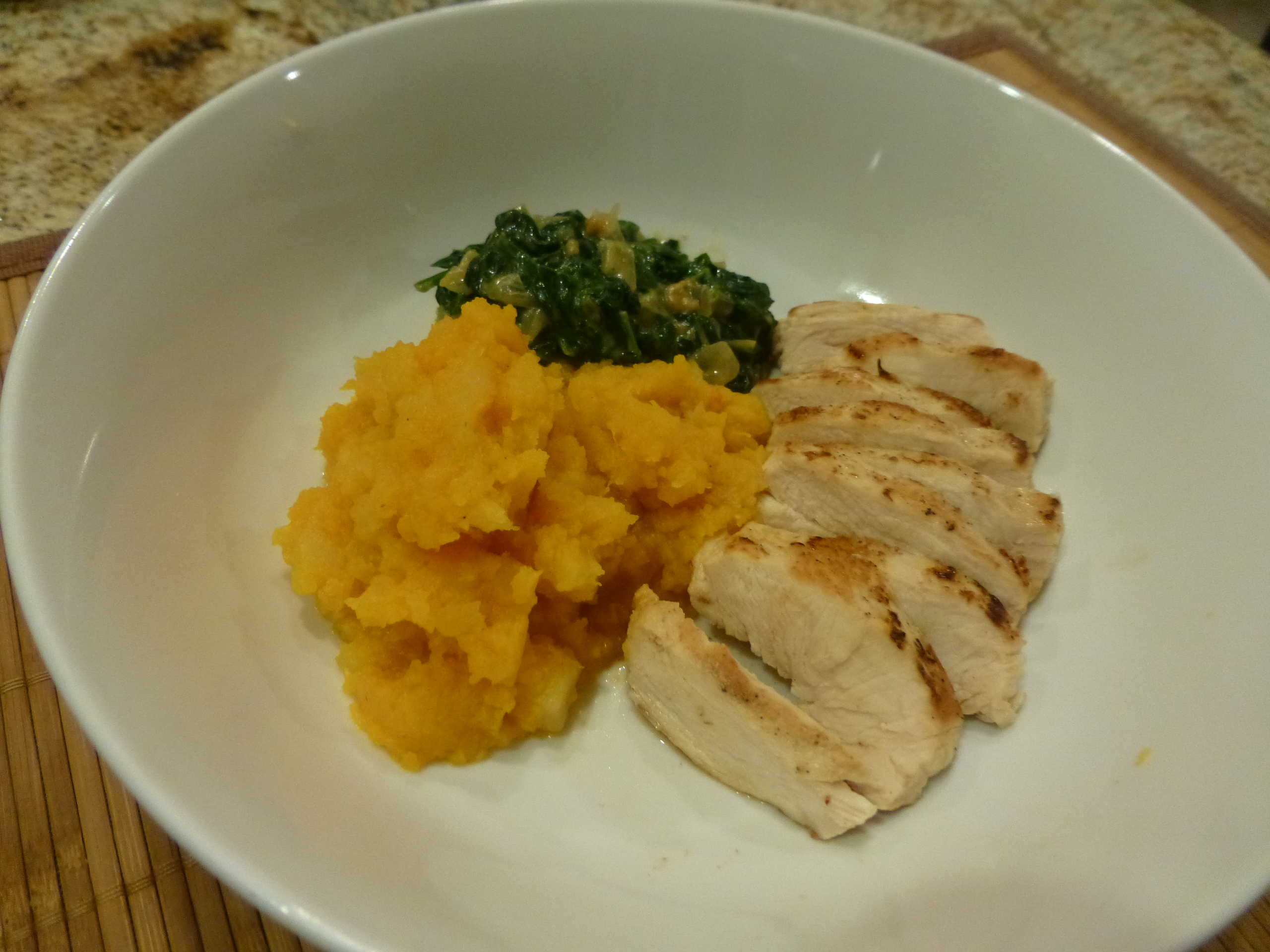 Luckily we have our dinner plan well in hand. John pan roasts the chicken breasts and I prepare a mash of last week’s butternut squash mixed with some rutabaga. Our green vegetable is baby spinach in a light white sauce enhanced with nutmeg. It is quite delicious. I have never been a big spinach fan but making it with a little onion, garlic, white sauce and nutmeg makes it really tasty. It is especially nice that I can buy already washed baby spinach in a bag at the store. Most important tip is to make sure your spinach is dry after it is cooked before you put the sauce on. Otherwise you’ll have a liquidy mess.