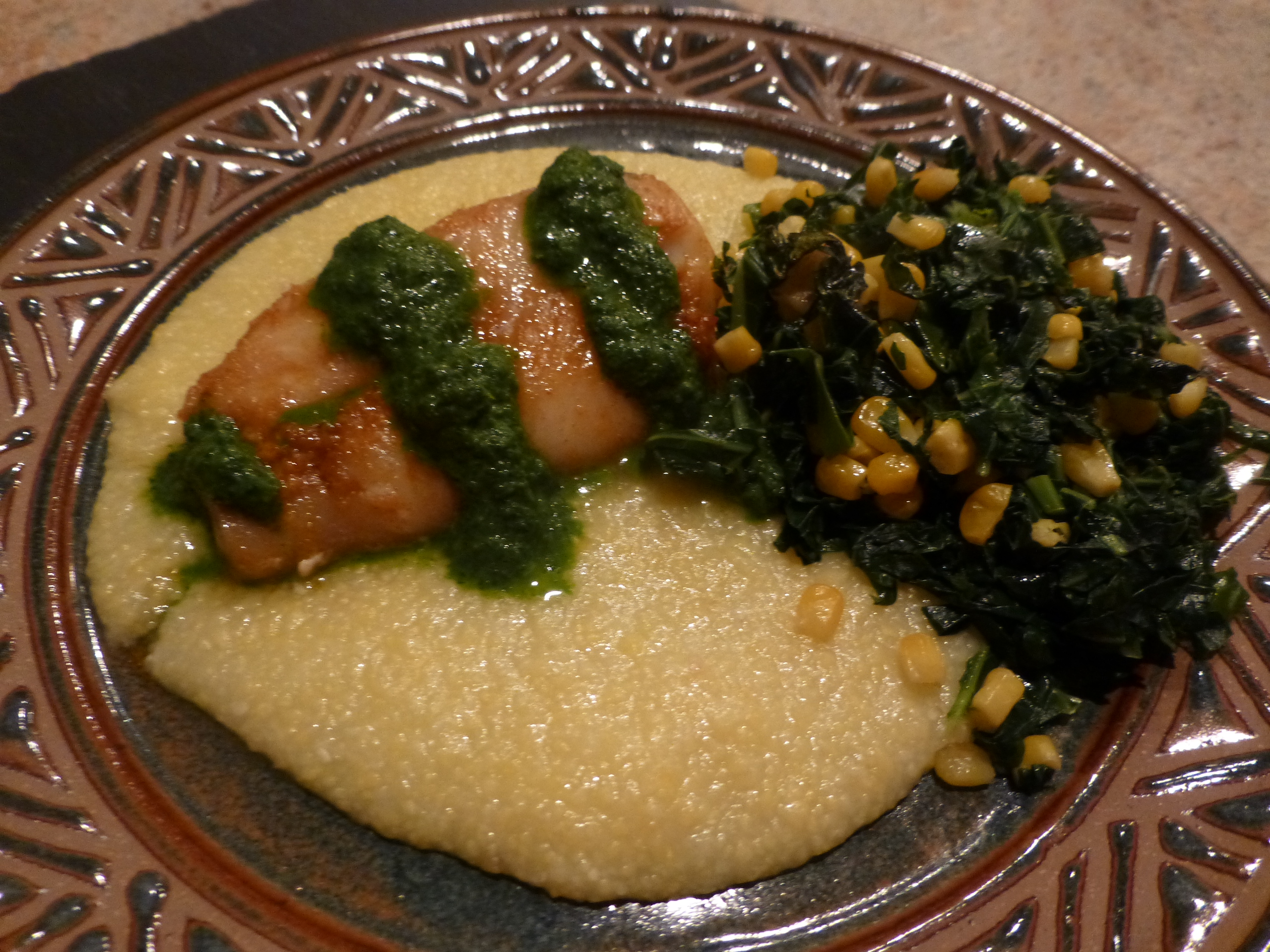 We decide to treat ourselves to a pretty fancy dinner. After all we were responsible for Jon having his birthday today and I worked damn hard bringing him into the world. Our dinner is baked cod with a parsley sauce, soft polenta, and collard greens with corn and garlic.