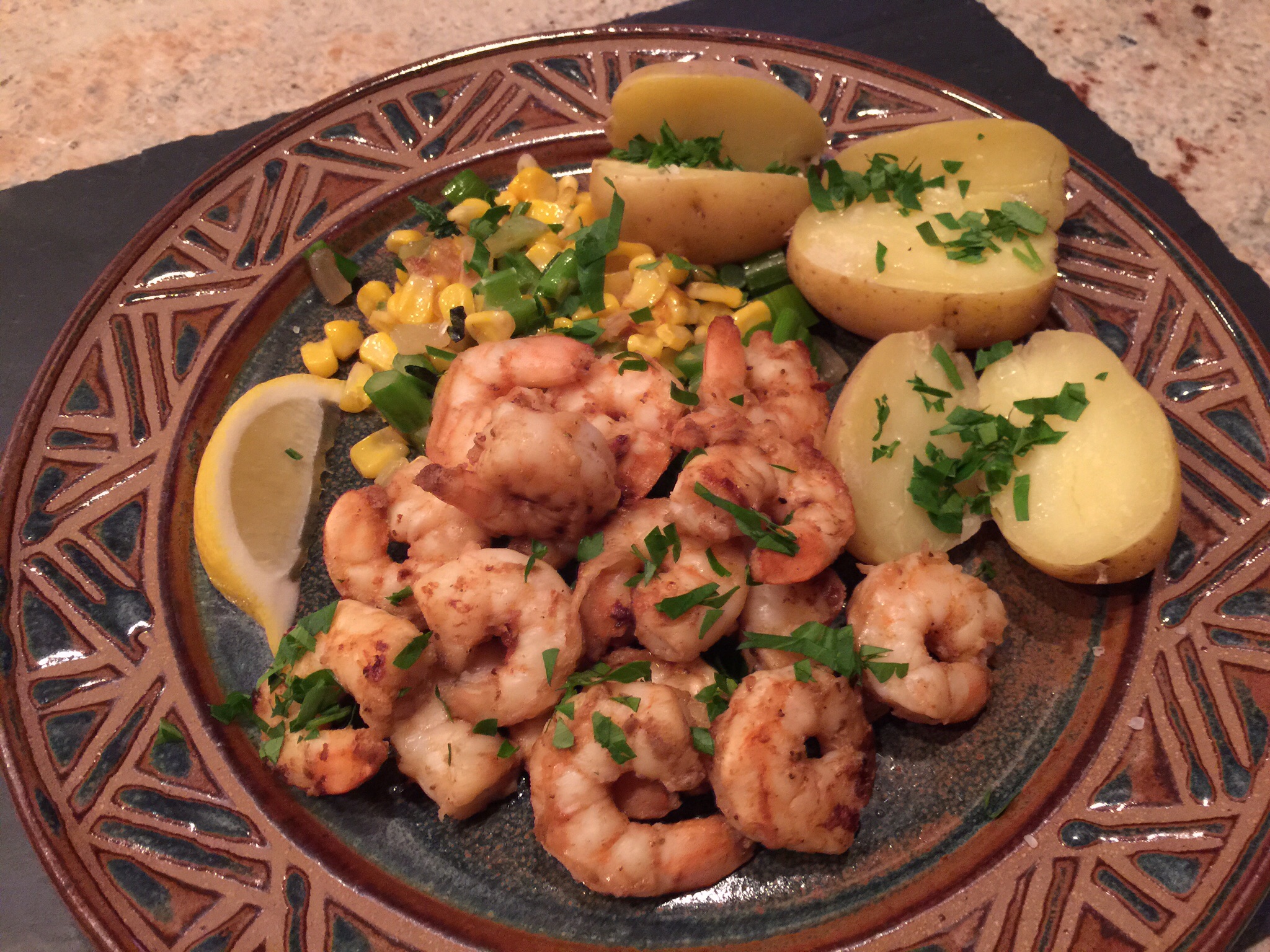 I steam the potatoes and John sautes the shrimp. The dinner takes about 1/2 hour to make. The sweetness of the corn goes well with the shrimp. The potatoes pop with a little butter, salt, and parsley. This is a good dinner and quick and easy to make.