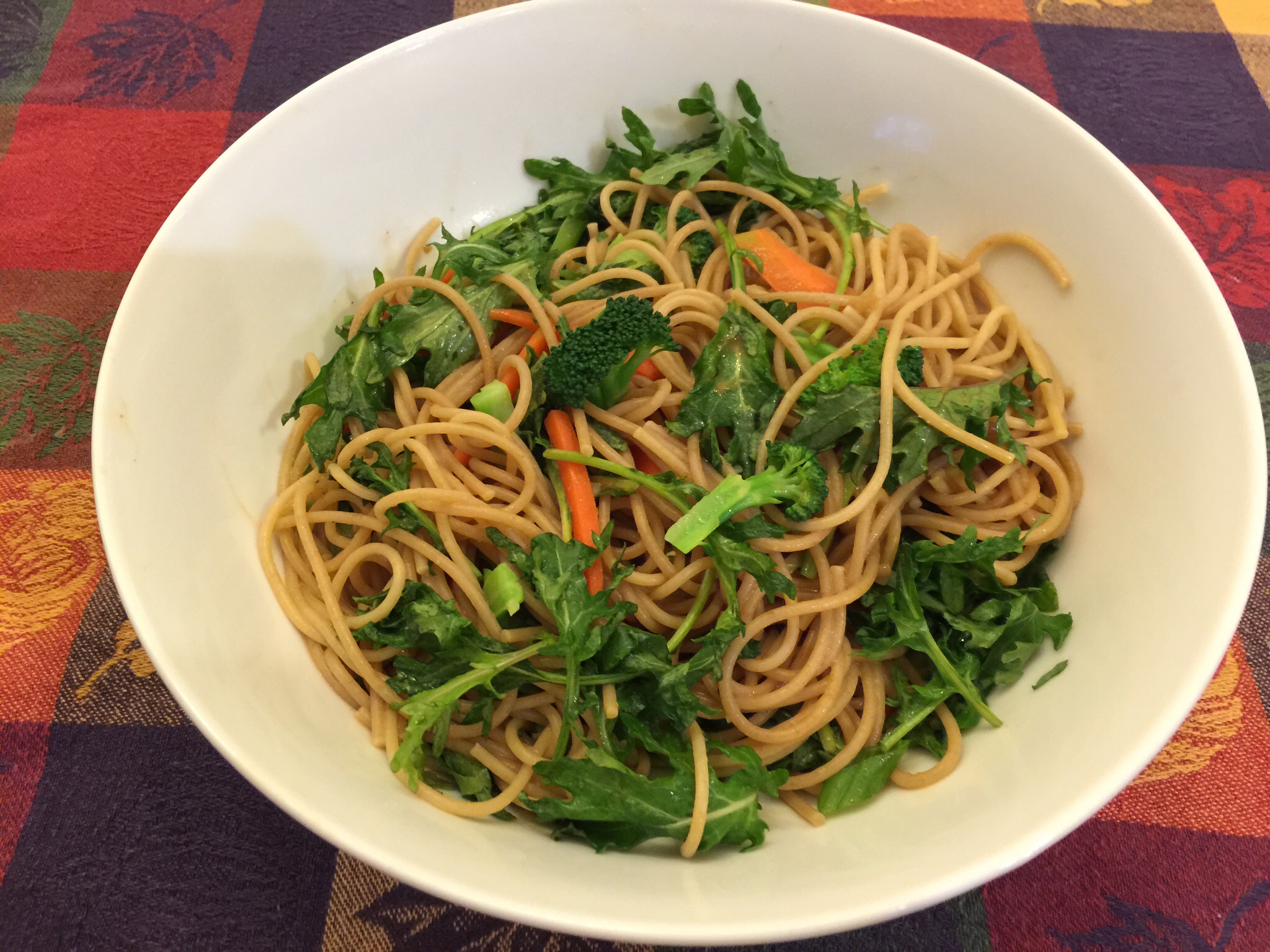 Really, there is nothing leap year about this recipe except the date I made it on. In order to stretch the dish and make it filling, I use a lot of vegetables. In addition to the spaghetti I add carrots, broccoli, and kale. The sauce is a couple of tablespoons of peanut sauce and a little pasta water.