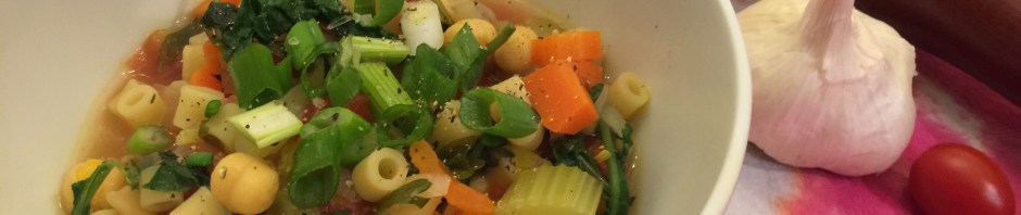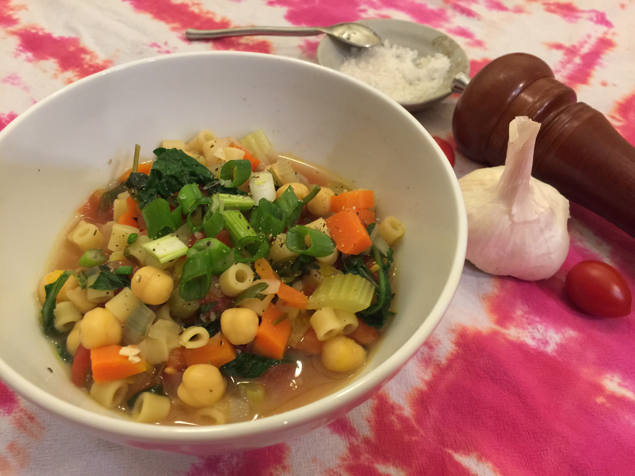 This is an adaptation of a chickpea stew I saw on NY Times Cooking. Sauté onions, carrots, celery, and garlic. Add thyme and chile flakes. Put in either chicken or vegetable broth. Then add chickpeas and some drained diced tomatoes. When it is boiling put in the pasta and when the pasta is almost cooked stir in the kale or some other green. I finished it with some chopped green onion, finishing salt and ground pepper. You could also add a little olive oil and some Parmesan cheese.
