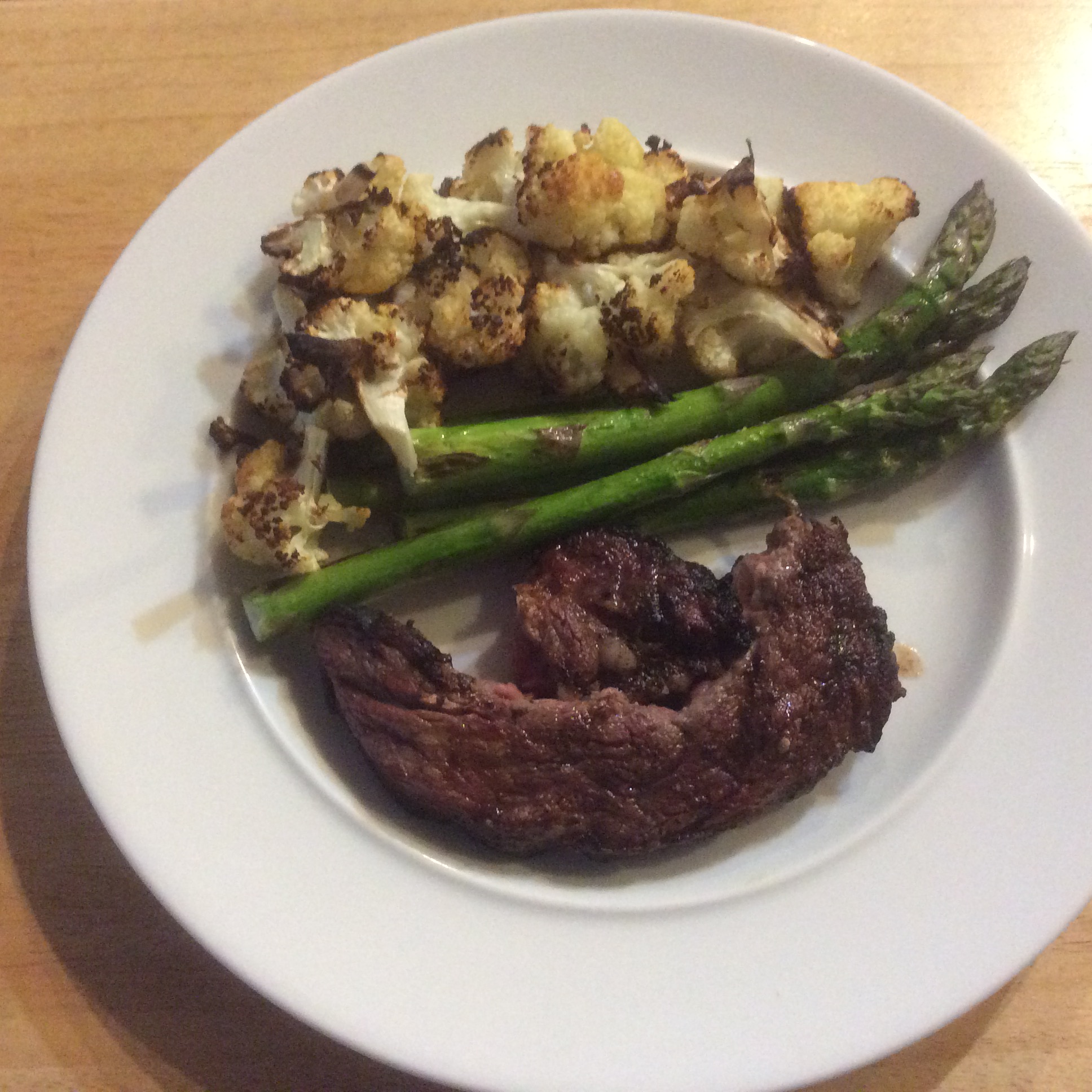 I don’t eat much beef but today we had an intense workout with our trainers today and felt pretty depleted. It was actually my idea to prepare steak which is unusual. John grilled the steak to a perfect medium rare while I roasted the cauliflower and pan-grilled the asparagus. Since we were eating meat that is calorie dense, we decided to have two vegetables instead of a vegetable and a starch.