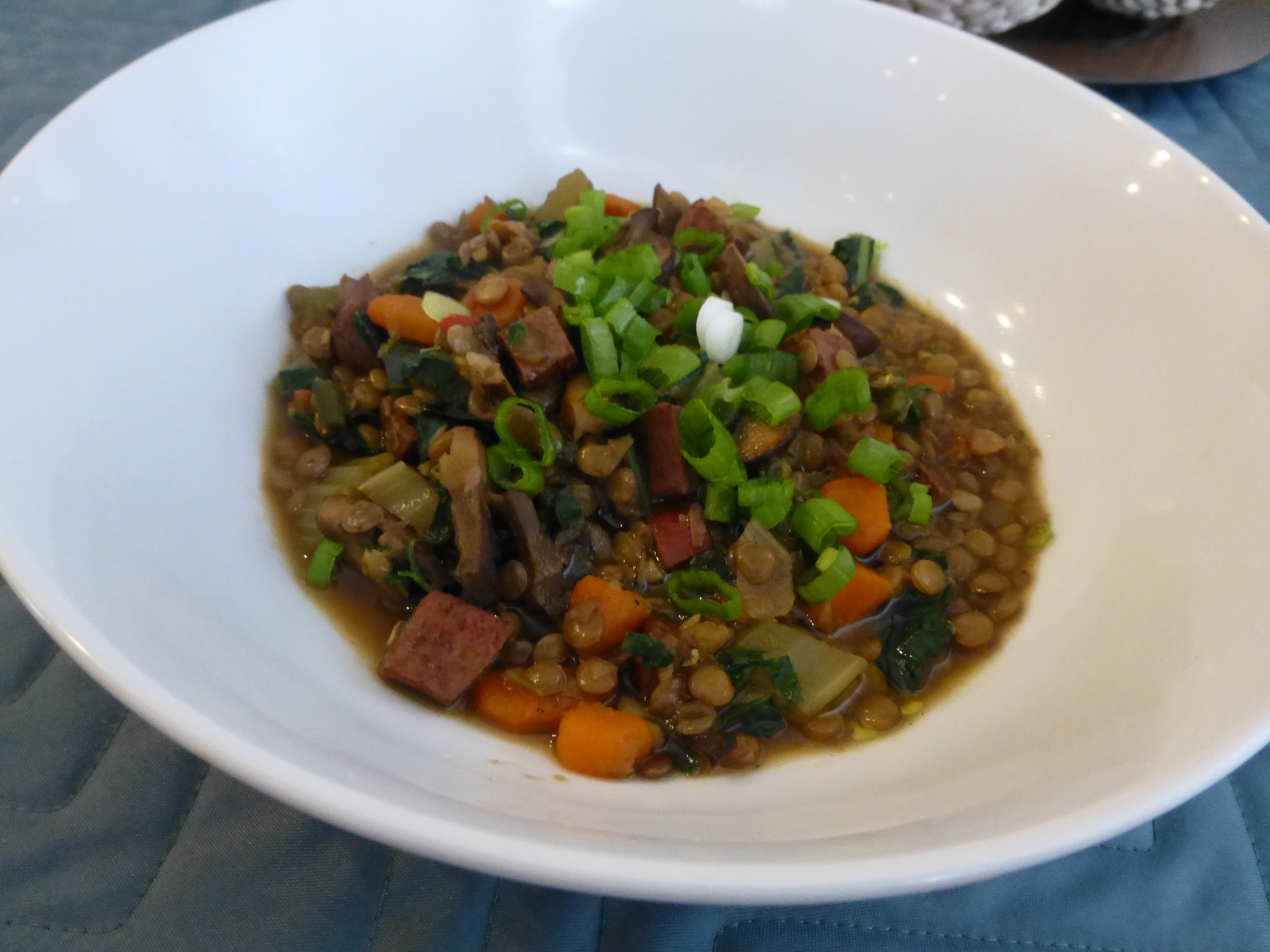 John had eye surgery today to remove a cataract so he needed a little comfort food – lentil soup with turkey sausage. Since I was cooking solo I really wanted this to come out well. I started out with a sauté of small dice of onions, carrots, and celery, then added the smoked turkey sausage and chicken broth. In about a half an hour when the lentils were tender I added larger chunks of the same vegetables plus some greens and the turkey sausage. Adding these components at the end of cooking insured that the vegetables would not be mush and all the flavor would not be cooked out of the sausage.