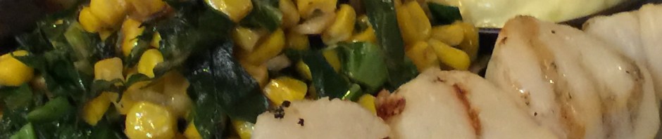 Since we have eaten a lot of meat lately we opted for scallops grilled on a skewer, grilled new potatoes, and chiffonaded collard greens with corn and garlic. I am thinking it doesn’t truly reflect my American hot dog and hamburger roots. Are scallops a patriotic food? It turned out okay but the scallops did not sear. I am afraid tripolyphosphate is the culprit. There was no mention of it on the frozen package but a white milky substance is what kept the scallops from searing.