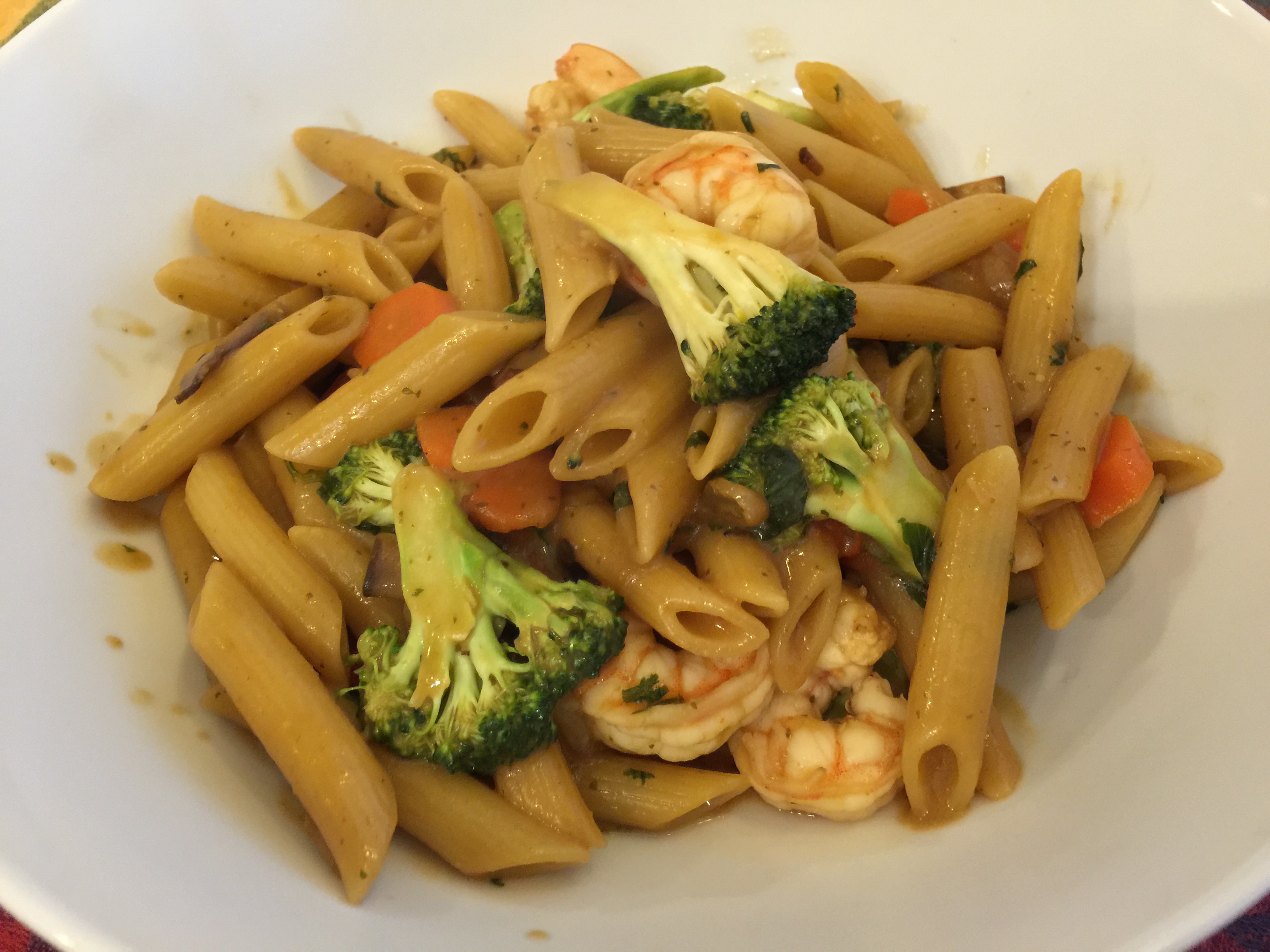 Put some water on to boil. In the meantime cut up the vegetables. Drop in the pasta when the water boils. Heat a pan with some olive oil. Put in the pan in this order mushrooms, onions, carrots, and garlic. About two minutes before the penne is al dente, add the shrimp and broccoli to the saute pan. Then add cooked pasta. Dress with peanut sauce.