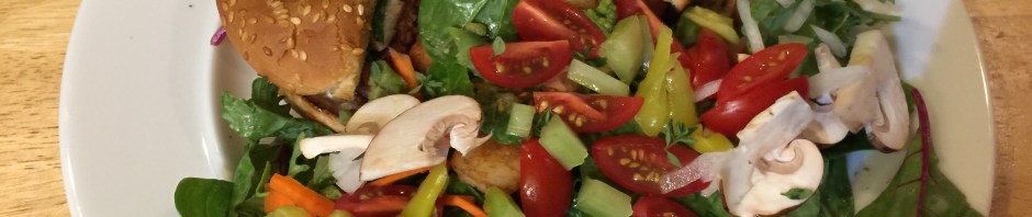 Tonight I made a big salad with lots of components to have alongside of some tater tots and a burger. I try to cover the majority of my plate with vegetables. I guess it assuages some of the guilt from the rest of the plate.