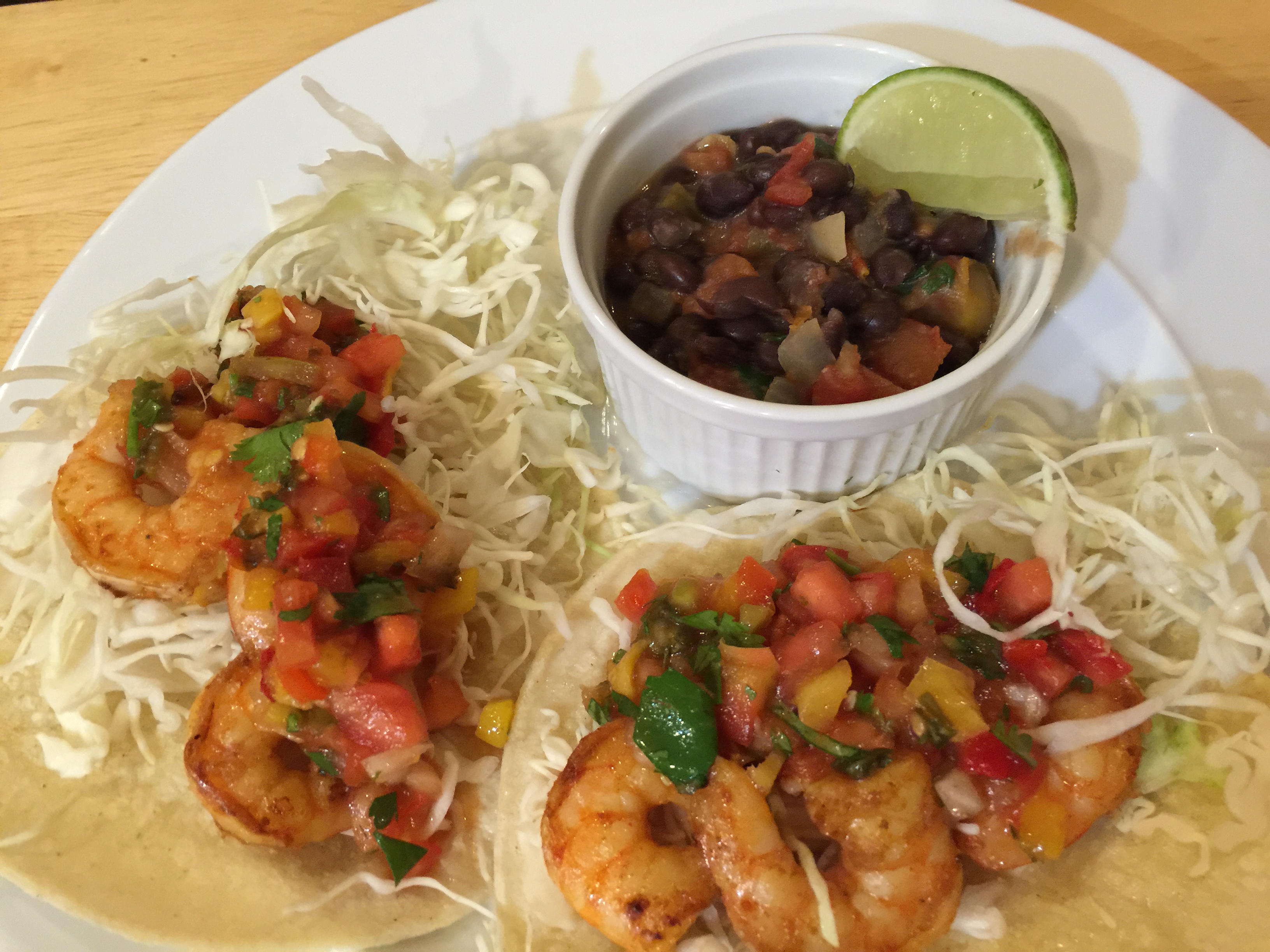 I really like this dinner! We have eaten it a lot lately but it is so tasty and easy to prepare that I imagine it will stay in the rotation for a while. Basically season and cook the shrimp, warm the tortillas, add shredded cabbage and mango salsa for the tacos. Drain a can of original Rotel tomatoes and jalapeños and add it to a can of black beans along with some additional hot sauce. Dinner done!