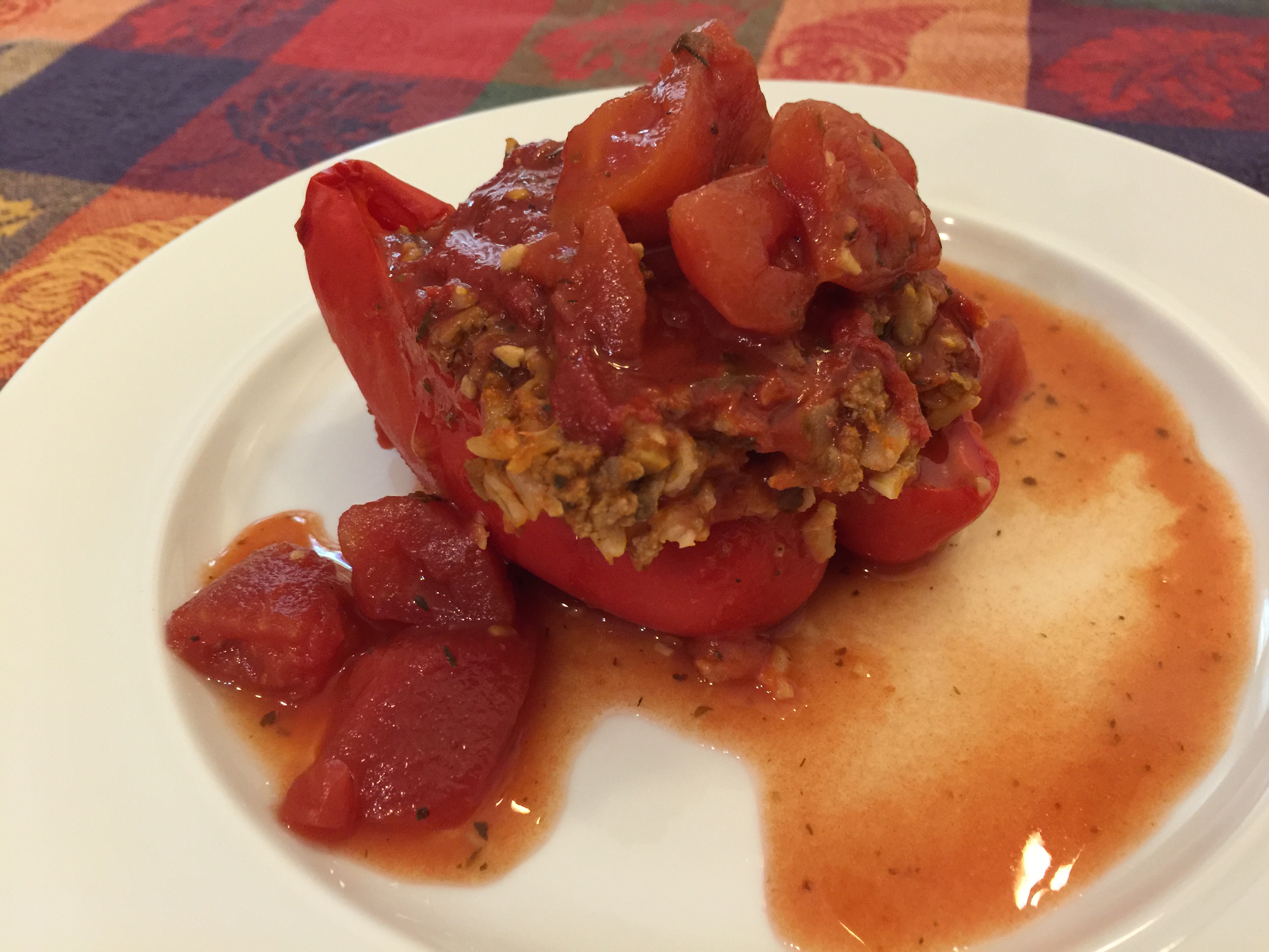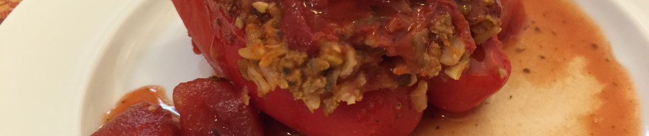 So I am still sick but when John suggested that he turn on the oven in preparation for making rice, I decided it was time to get up off the couch and do something. Dinner tonight was stuffed red peppers. For a change we stuffed them with ground beef and brown rice instead of ground turkey or mushrooms and farro.