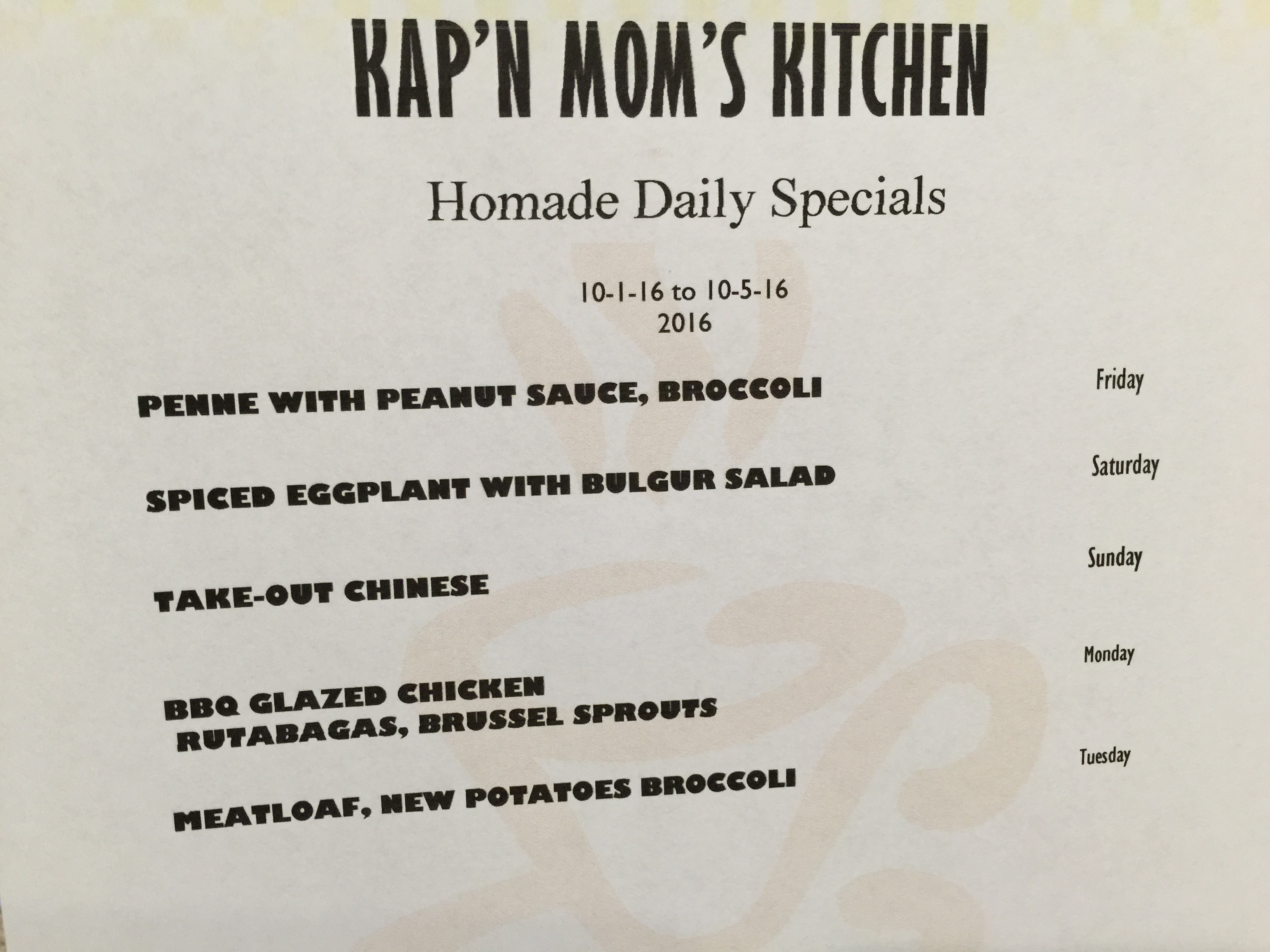 Never eat in a place called by a relative’s name, i.e., Mom’s, Aunt’s, Dad’s, Grandma’s, etc. Or a military name such as Captain’s. Beware of the adjective “home made” or its scary cousin “homade.” Avoid all dialect restaurant names such as “Unca Jim’s Homade Cookin'”. And lastly do not patronize a place which uses alternative spellings such as Olde, Shoppe, or Kountry.