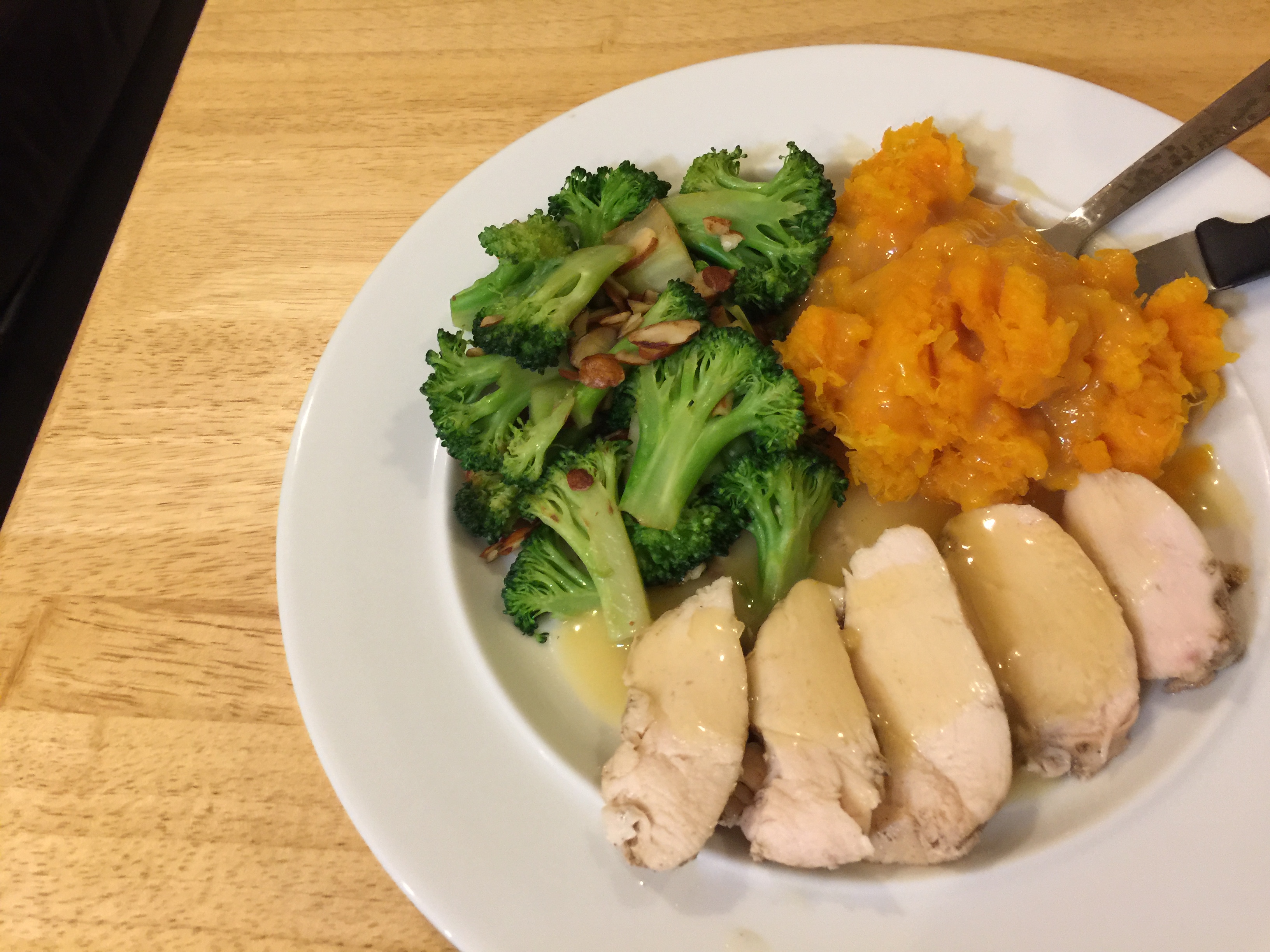 Tonight we had the typical chicken recipe and veg and starch combination. John sous vide one large chicken breast and made some gravy out of a packet. I steamed the broccoli and added some almonds for crunch. The butternut squash that I had left over from the orrecchiette last night was augmented by some frozen diced squash so that there was enough for two servings. It was just kind of a ho-hum chicken dinner but comforting nonetheless less.