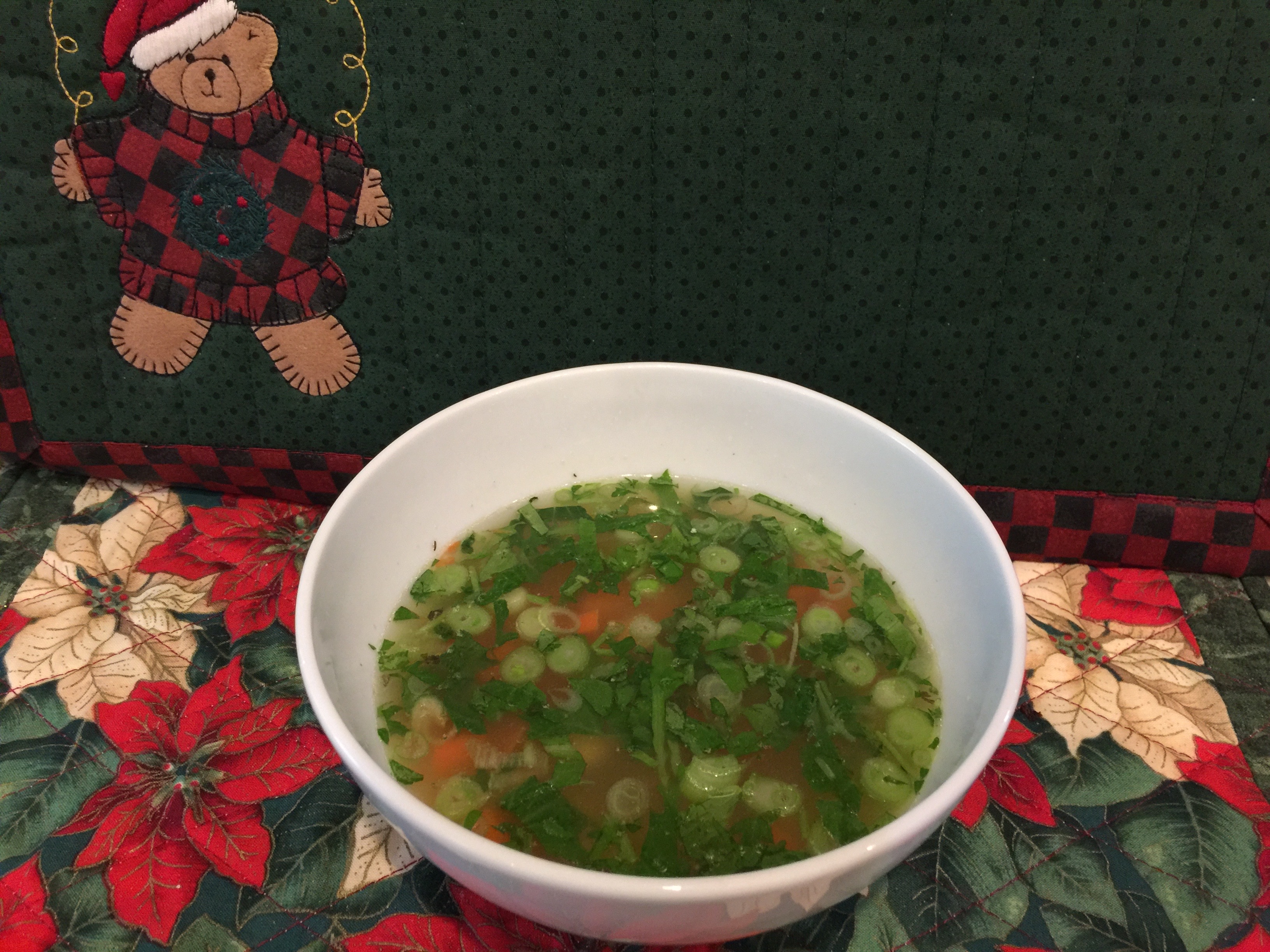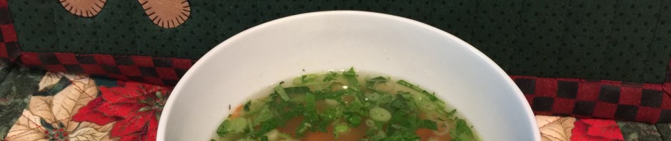 It is chilly and gloomy in sunny California today. I need something warm for lunch! I look in the refrigerator (rummage, rummage) and I find some chicken from last night’s sous vide, a container of brown rice that I made on Monday, half of a carrot, half of a green onion, some wilting dark greens from a ready-to-eat salad mix, and a partial box of chicken stock. Sounds like soup to me! Two minutes of chopping, two and a half minutes of microwaving, and thirty seconds of picture taking and I am having my lunch soup in 5 minutes!