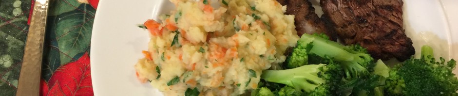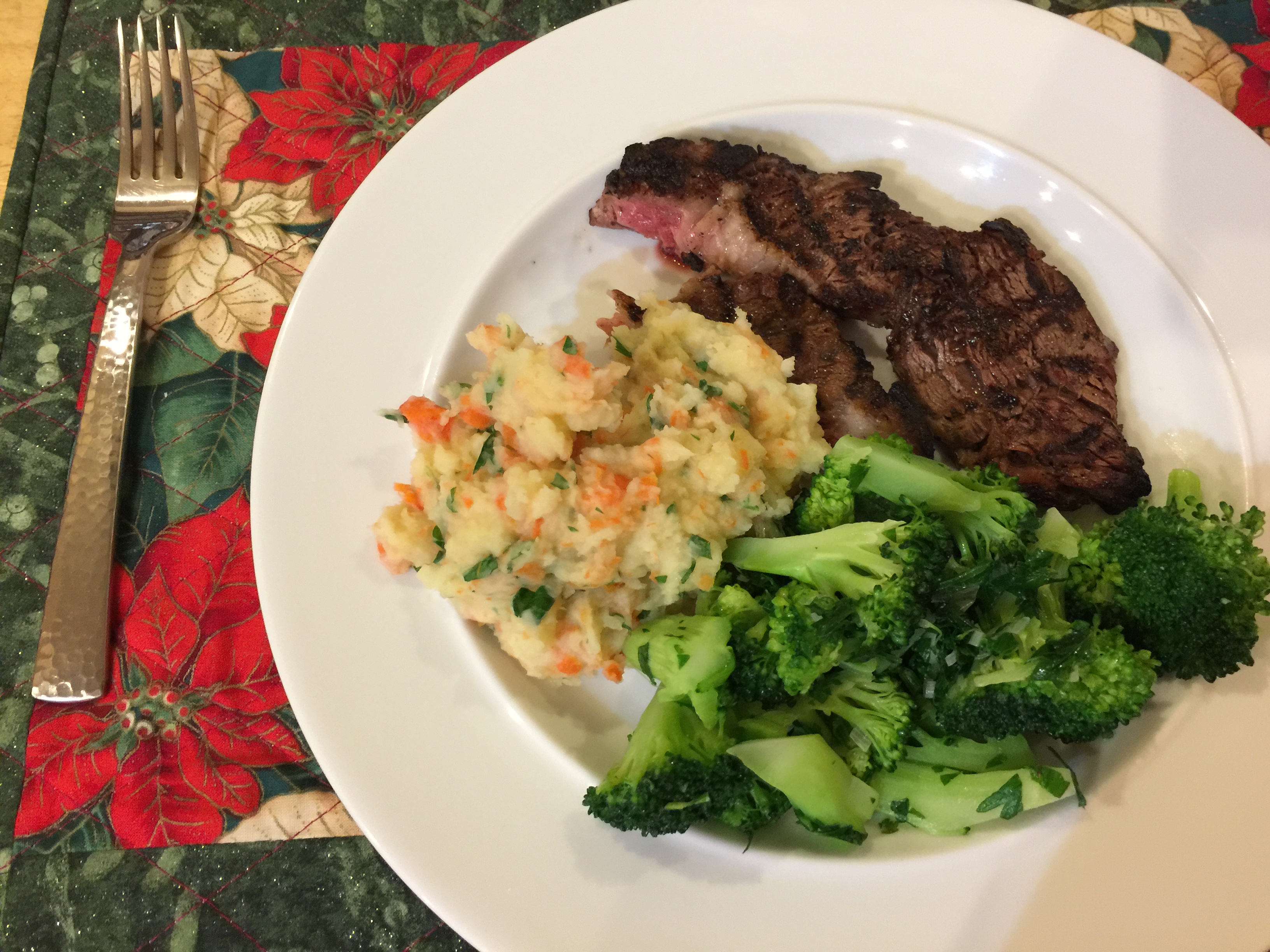 John grilled a steak and we split it. John takes the eye part and I have the cap. It is yummy. I also made this mash which I call confetti mash. I had some leftover mashed potatoes and added parsnips, carrots, and parsley to them. It came out looking pretty festive. And now that it is getting more wintery out I am thinking we will be seeing a lot of broccoli.