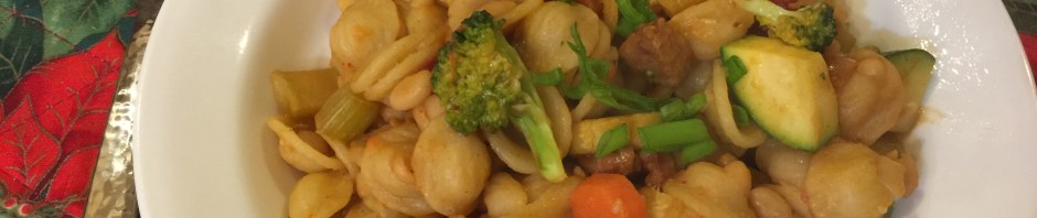 This was a clean out the refrigerator kind of dish. The sauce was basically a little olive oil and pasta water. This can easily be made vegan by omitting the turkey sausage.