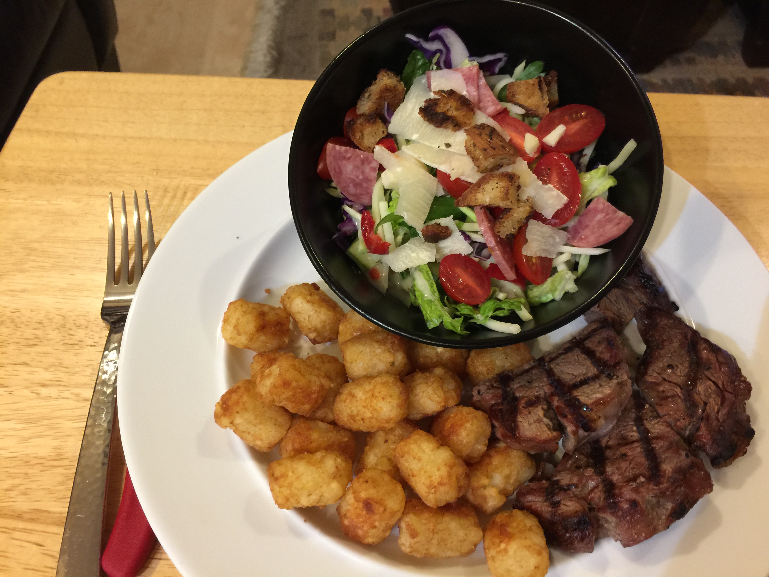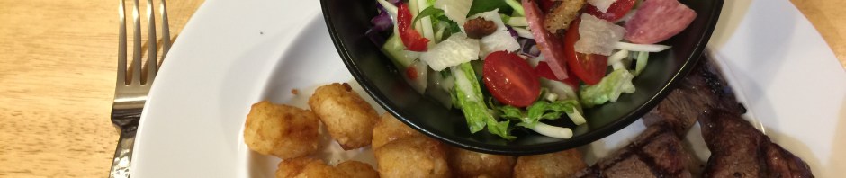 That being said it was a pretty great salad with a side of steak and tatertots. I do not like preparing salad for some reason so a really good salad is good therapy for me. I even made crispy croutons seasoned with garlic, oil, and oregano! It was a good dinner with John grilling the steak, and me making the salad and tots.