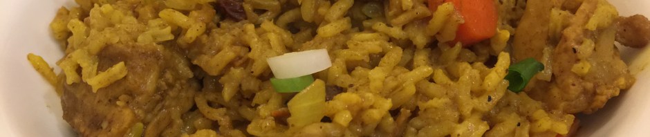 I do so love this dinner!!! John cooks his curry combination and then adds onions, carrots, cut-up chicken thighs, rice, and raisins.