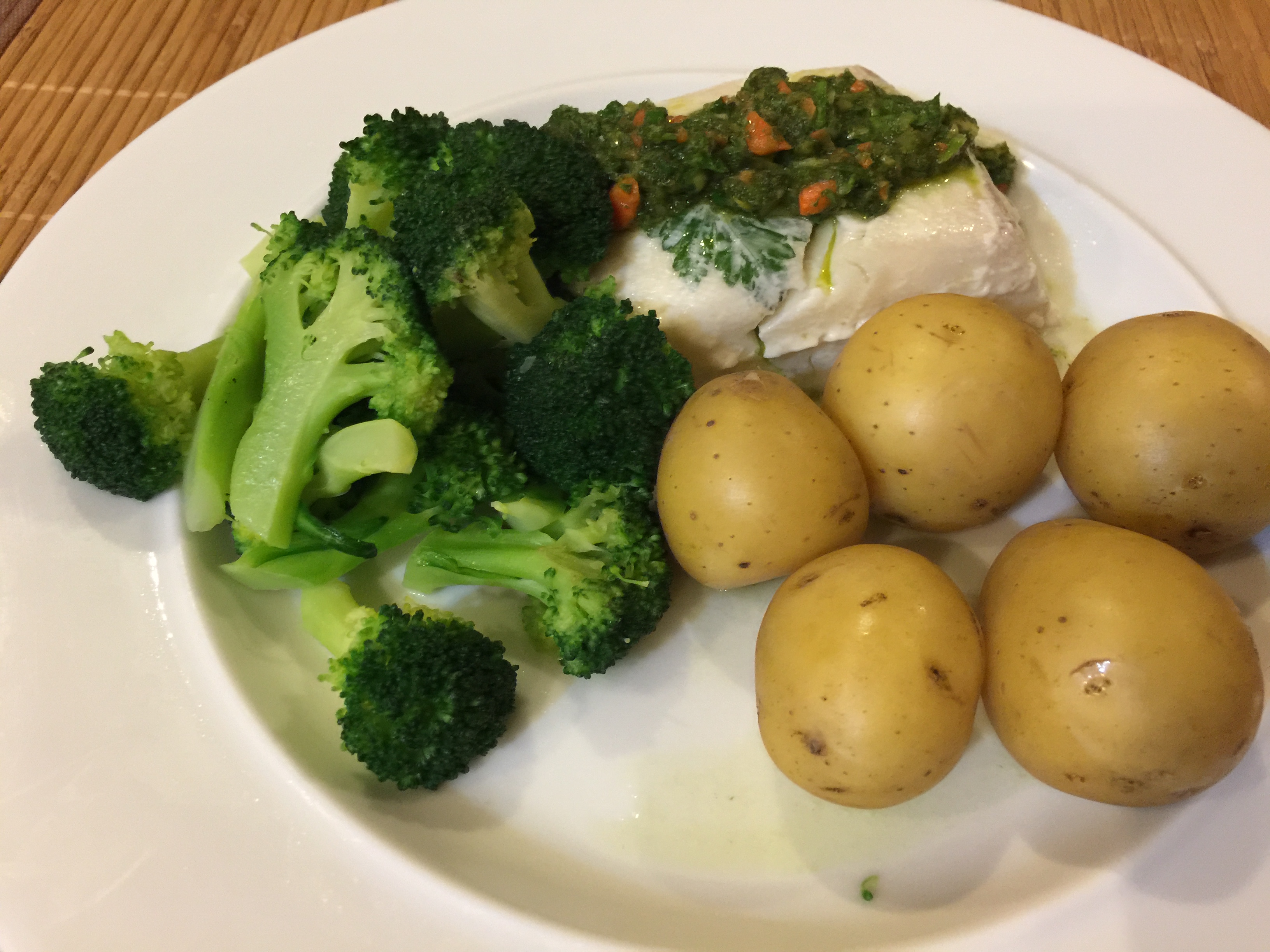 We cooked the halibut with our Anova sous vide but it came out not quite right. We are having trouble getting fish right. We set it at 130F after reading various suggestions. It was a little over done and at the same time not quite hot enough. We need to work on this more. Parsley sauce was leftover and frozen from some other fish dinner. I updated it with additional garlic and olives. Broccoli and potatoes were simply steamed.