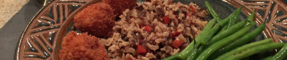 After drying the scallops thoroughly, I dredge them in seasoned flour, then dip them in egg, and finally roll them around in panko breadcrumbs. John uses our electric wok to cook them (outside so the kitchen is not coated in grease!) I made the combo rice this morning in the oven and gave it a little more flavor with the addition of bell pepper and green onion. The beans are simply steamed.