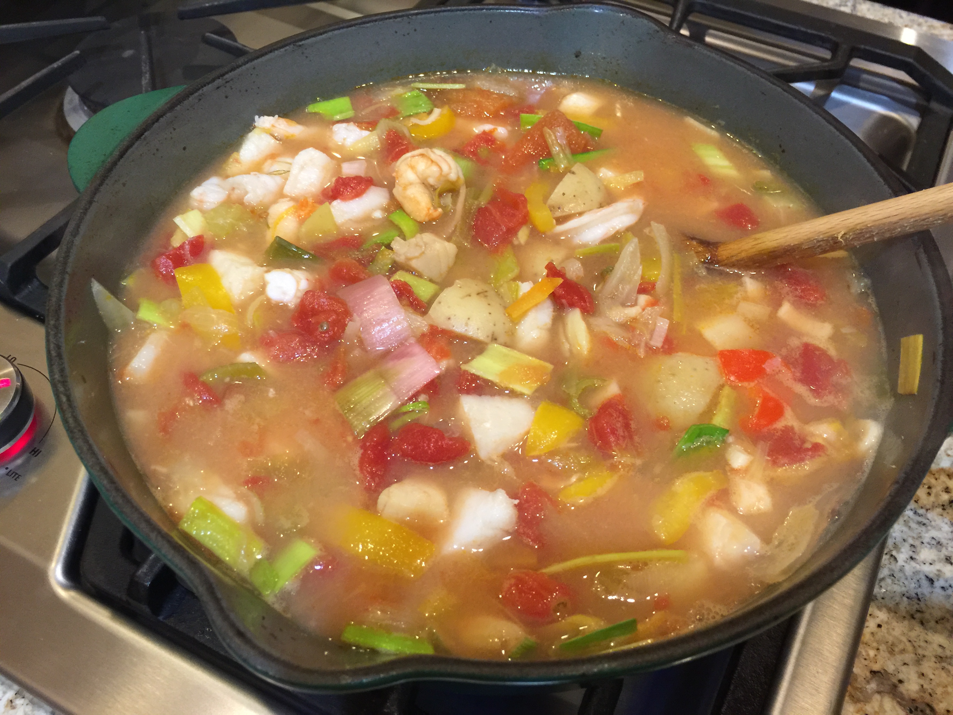 Here is our pot of fish stew left over from last week. John added some additional cod and shrimp and I added a leek, drained tomatoes, celery, and a half of a yellow pepper. We warmed it up and enjoyed it a second time. Now there are more leftovers! I think we’ll freeze those.