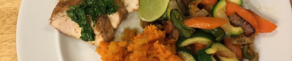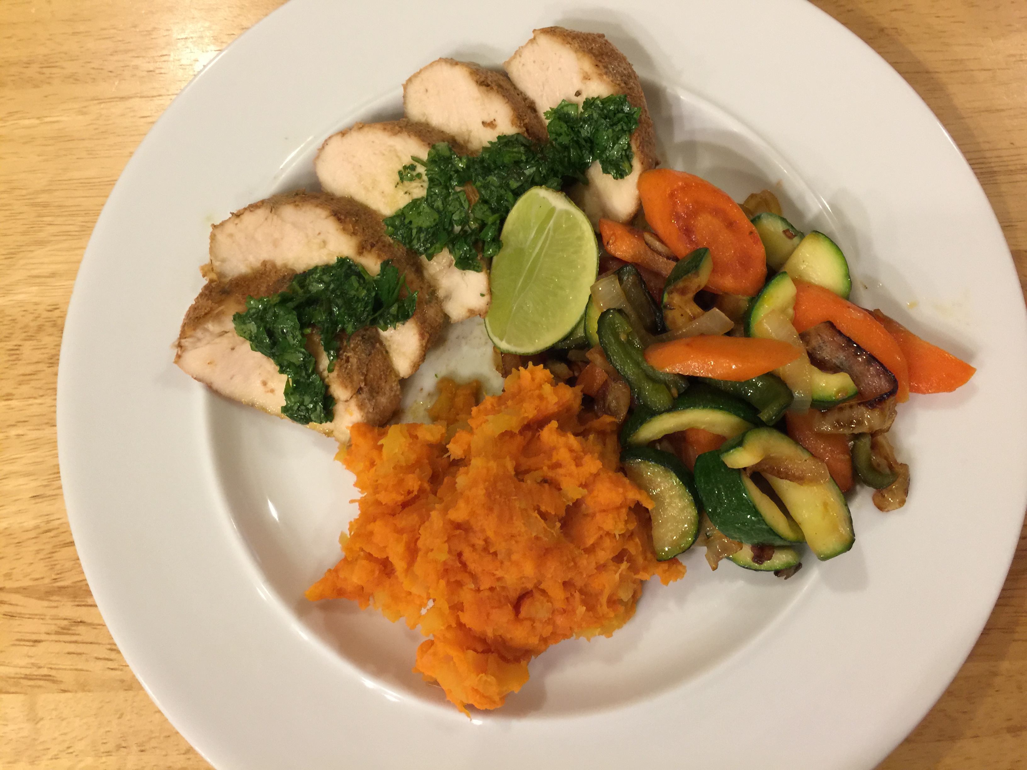 The rest of the meal included a mash of leftover rutabagas and a microwaved sweet potato. John sous vide the chicken breast and served it with a lime/cilantro sauce.