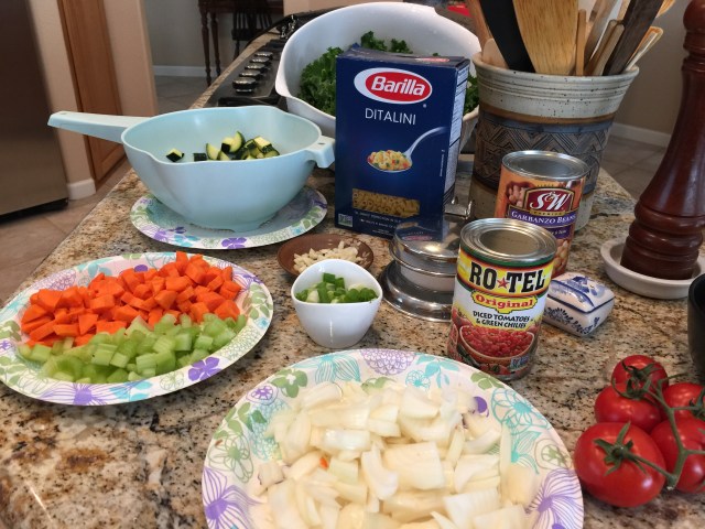 Much more than actually cooking, I like to cut things up. I would be the perfect sous chef. This chickpea stew has plenty of chopping and is inspired by the NYTimes Cooking’s “Chickpea Stew with Orzo and Mustard Greens.” Except that I use ditalini, kale, add zucchini, and substitute Rotel for the fresh tomatoes. The recipe calls for chicken stock, vegetable stock, or water and finishing it with Parmesan cheese. What you do depends on whether this is vegan or vegetarian or neither.