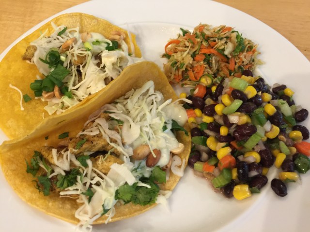 The slaw is dressed with a peanut sauce and the other dish has black beans, corn, carrots, cilantro, jalapeño and a sweet and salty sauce.