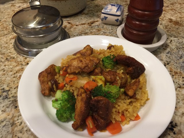 Tonight the chicken made an appearance with a new curry spice I got from Penzeys, Rogen Josh. It smells really good. John did a rub on the chicken and also put it in the rice. I cut up some onions, garlic, carrots, and broccoli to make the dinner filling and healthier.