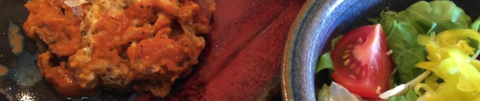 We are opting for an easy heat and serve dinner tonight. This Michael Angelo eggplant Parmesan has been hanging out in the freezer for too long so it is time to heat it up and eat it. In some world it serves six but not in ours. I probably have two portions and John has four. It takes about 15 – 20 minutes in the microwave to cook through from frozen. Along with a salad this is a tasty vegetarian meal and a lot less mess than when I make eggplant Parmesan myself!