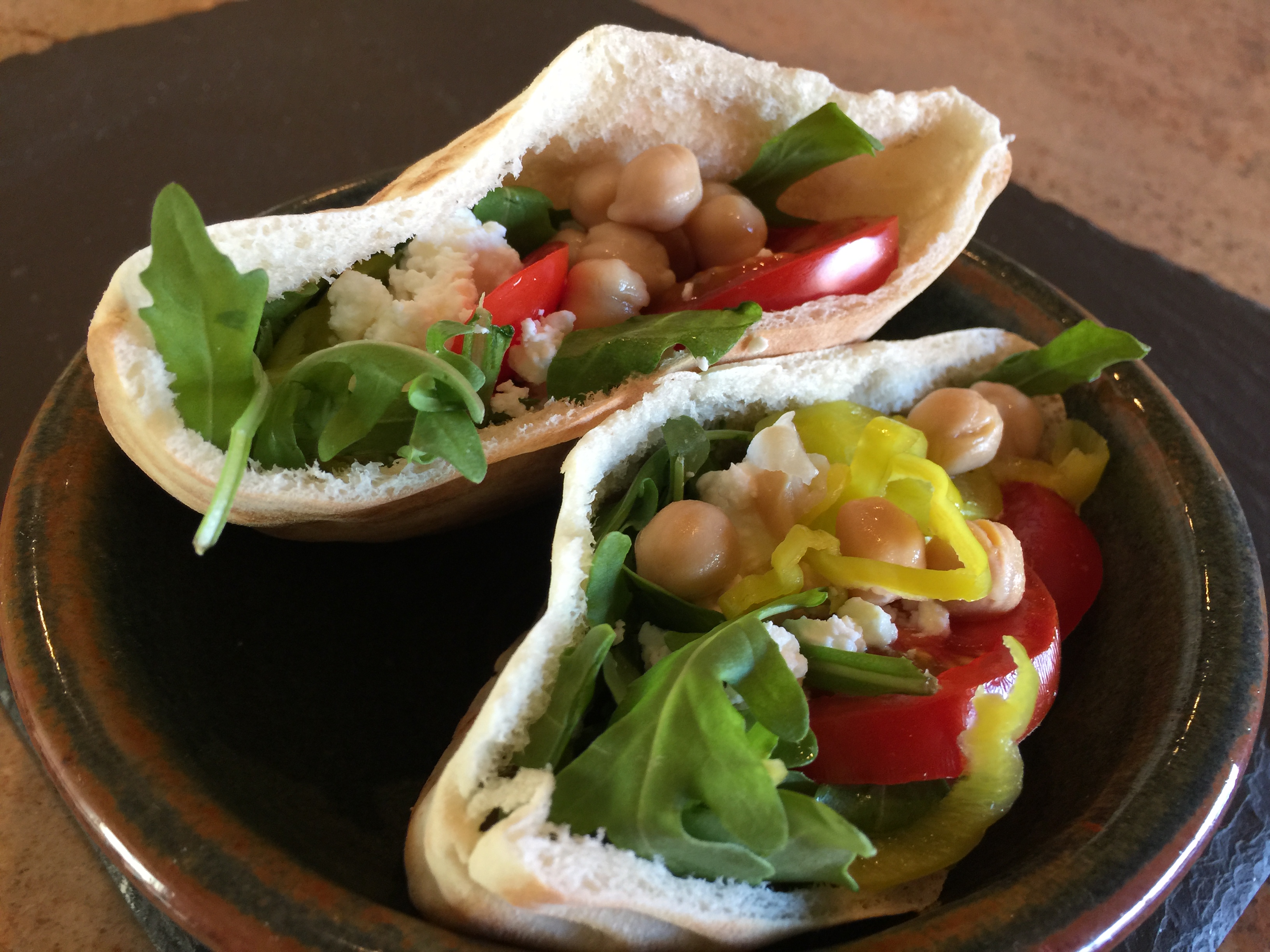 After lightly toasting the pitas I stuffed them with chickpeas, tomatoes, pepperoncini, arugula, and feta. I dressed the sandwich with a light vinaigrette.