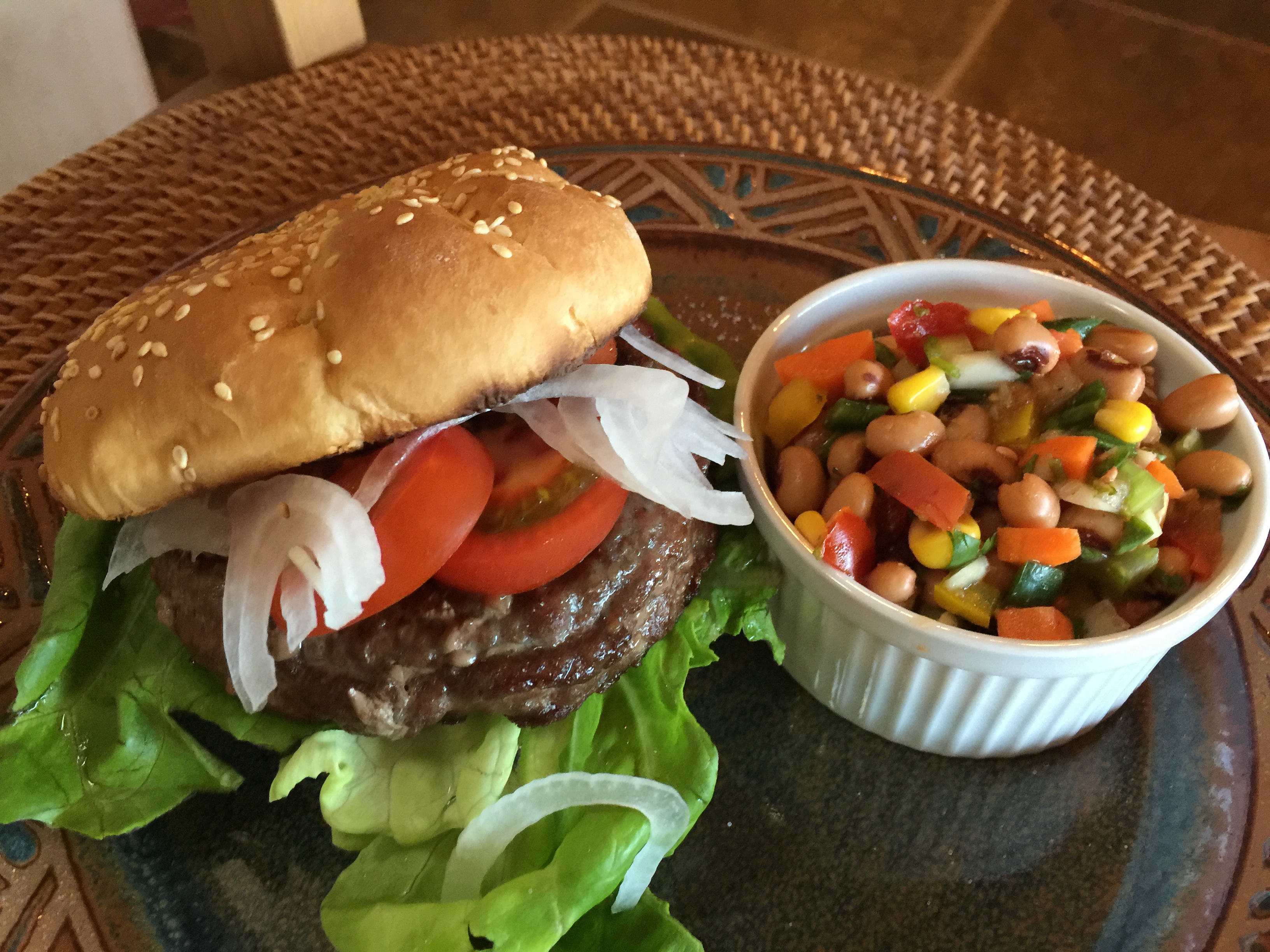 We had our Memorial Day grill fest on Sunday instead of Monday and we had my favorite, burgers. Once again I served them in my semi-roll style. When eating this you flip it over so the roll is on the bottom and the lettuce is on the top. Easy to hold, tastes like the real thing, and saves probably one hundred calories. Also made up some more Texas caviar but this time with fresh tomatoes, black-eyed peas, and a cayenne chile for some extra spice!