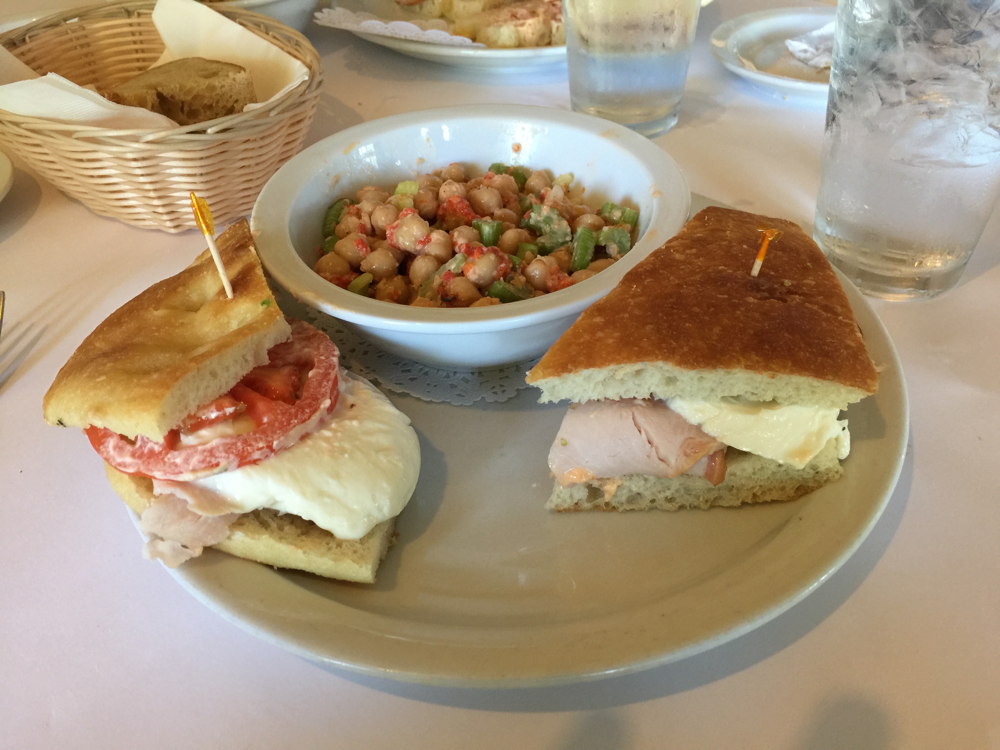 First take the giant bowl of chickpeas off the plate. Next, take the top piece of bread off the sandwich. You don’t need that much bread plus it has a lot of the dressing on it. Remove one of the pieces of cheese. You can put all this stuff to the side on that little doily that was under the chickpeas. Spoon maybe a third of the chickpeas back on your plate. Take the bread and cheese doily and place it up-side-down on top of the remainder of the chickpeas. Finally, eat your lunch with a knife and fork. It will take much longer and be more satisfying. Also make a mental note that next time you eat here to order one sandwich and one side for the two of you!