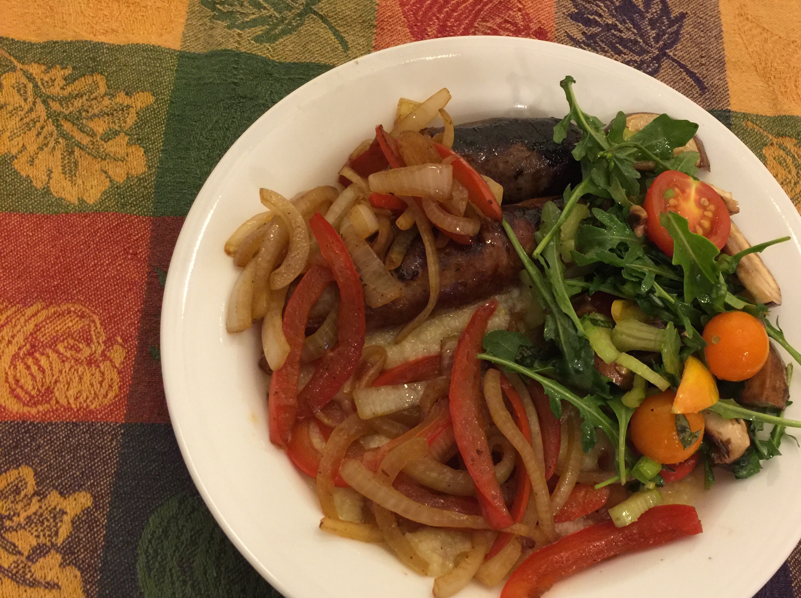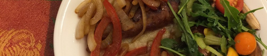 Leftovers night! The sausages and polenta are from the night we had friends over for dinner, the peppers and onions are newly made but originally for the friends dinner, and the salad is the same as the golden beet, tomato, arugula, and watermelon from the salad on the 24th. So there is hardly anything new here except that I prepared fresh components because I bought too much in the first place. Not sure that these are technically leftovers but we are leaving for the “Great Road Trip, 2017” on Monday and I need to get this stuff eaten up!!
