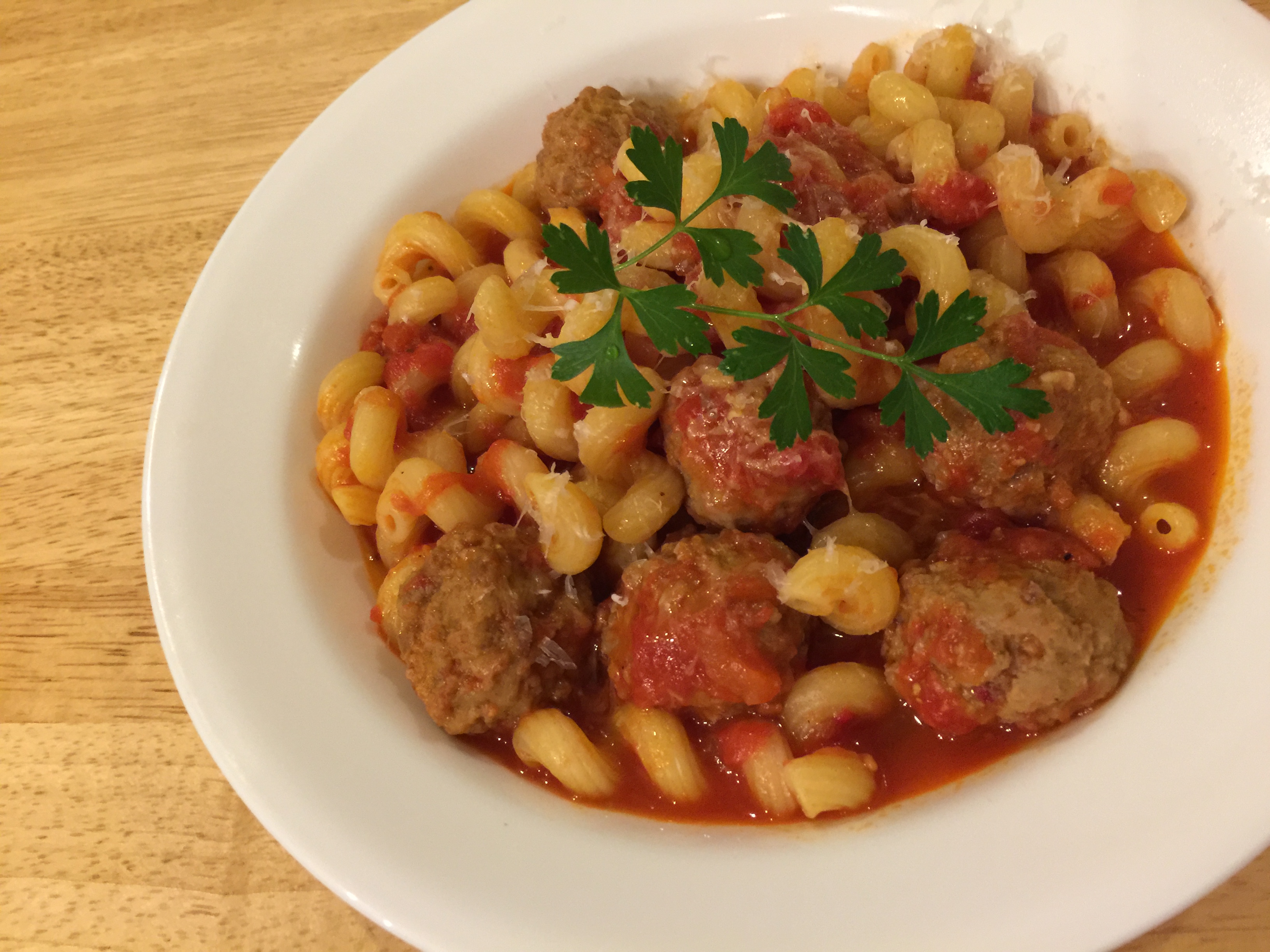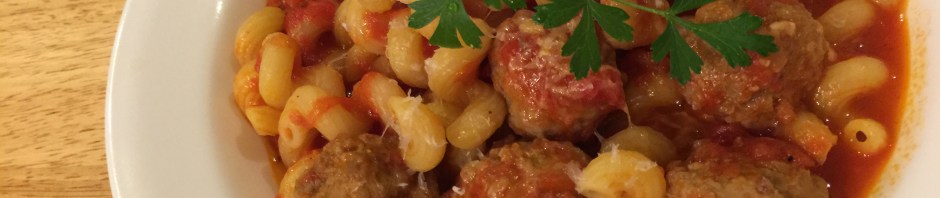 The fresh tomato sauce from a couple of night’s ago is sitting in the refrigerator and we have been out all day and I do not feel like making the planned dinner. So I decide to boil up some pasta, add another tomato to the sauce, and microwave some frozen meatballs. I add the meatballs to the sauce and in the time that it takes to heat up the water and cook the pasta, dinner is ready.