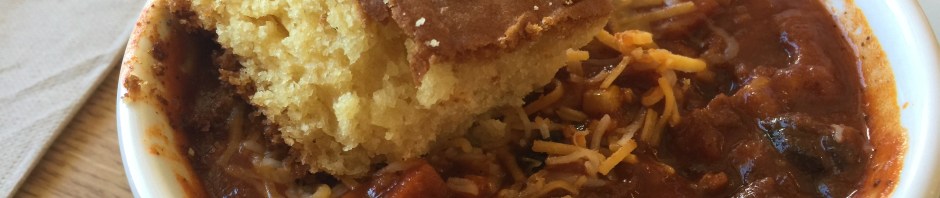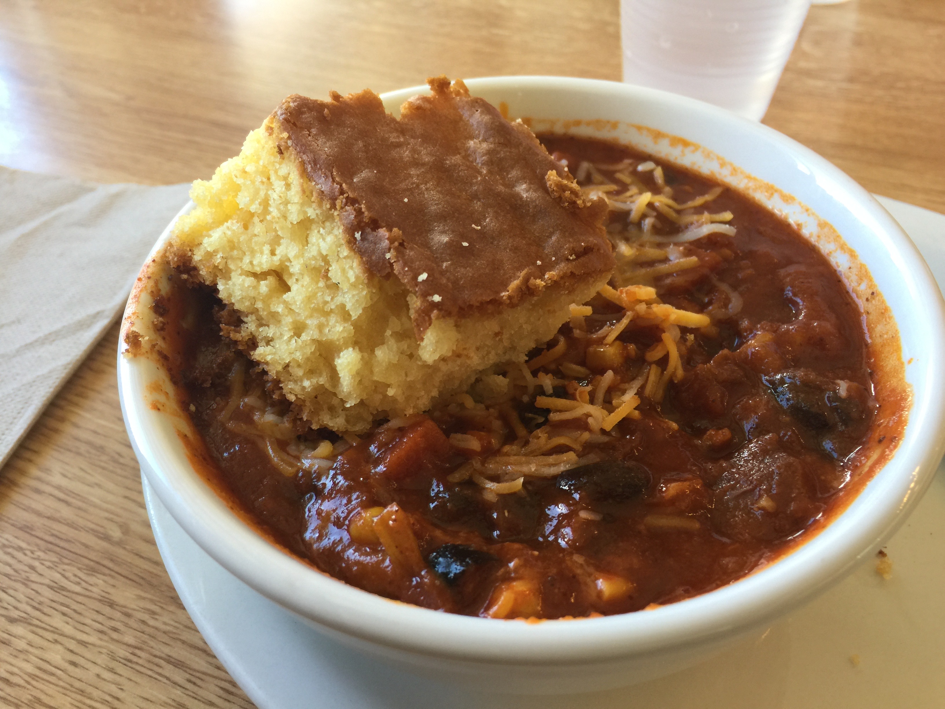 There are some good choices here. Ahi sashimi and some salads. The fish tacos are a trap because they are fried. I just don’t think I want to eat sashimi in the middle of the mountains and salads do not fill me up. So I go with vegetarian chili. To their credit, they ask if I want shredded cheese in case I am a vegan. But I get cornbread and that is made with eggs I am sure. Anyhow, it is a bit gloppy and thick. Uh oh, it tastes best when I crumble the corn bread into it. Grade? I tried