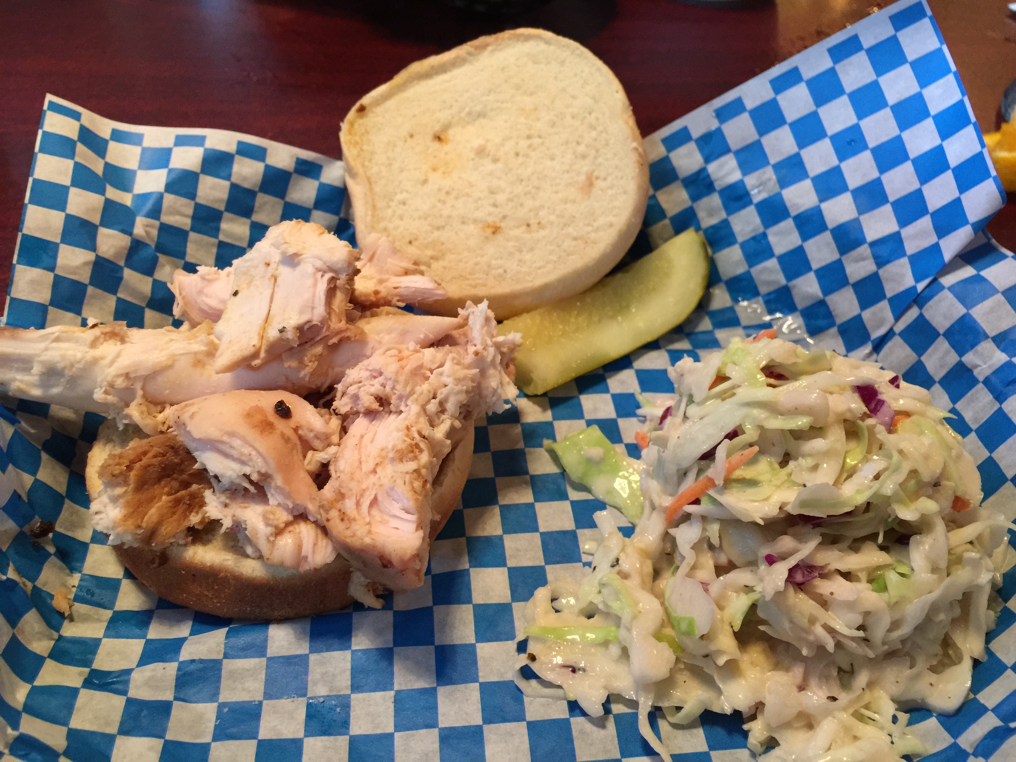 I ordered a Pulled BBQ chicken sandwich. Basically it was some pieces of chicken breast on a roll. I took out the chicken and dipped it in some vinegar based BBQ sauce. I took a bite of the roll but it wasn’t worth eating. I ate the coleslaw and the chicken. Grade? Wish it tasted better