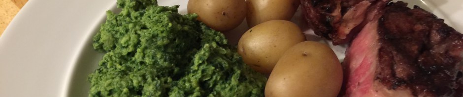 The piece of meat he made was a prime ribeye cap steak. We got it at Costco. It is a narrow strip from the top of a ribeye steak. It is spiraled up and tied with string. He cooked it in the immersion circulator set to 125F. We let it stay in its bath for about 2 hours until we were ready for dinner. At that point John turned on the grill and seared each side for 2 minutes. It came out perfectly! I steamed some delicious tiny new potatoes and we had the rest of our spinach soufflé from the other night.
