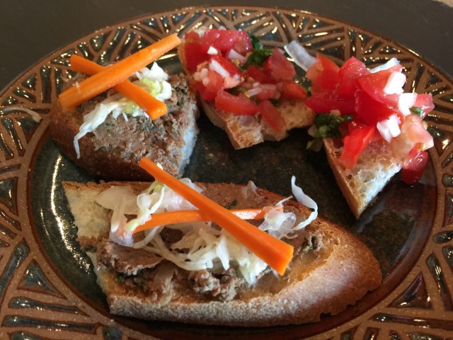 I made the pate myself from actual chicken livers. I am not impressed with the quality of the livers from Harmon’s and if I made these again I would buy my chicken livers somewhere else. I also pickled the carrots, onions, and cabbage. The tomato crostini were much easier.