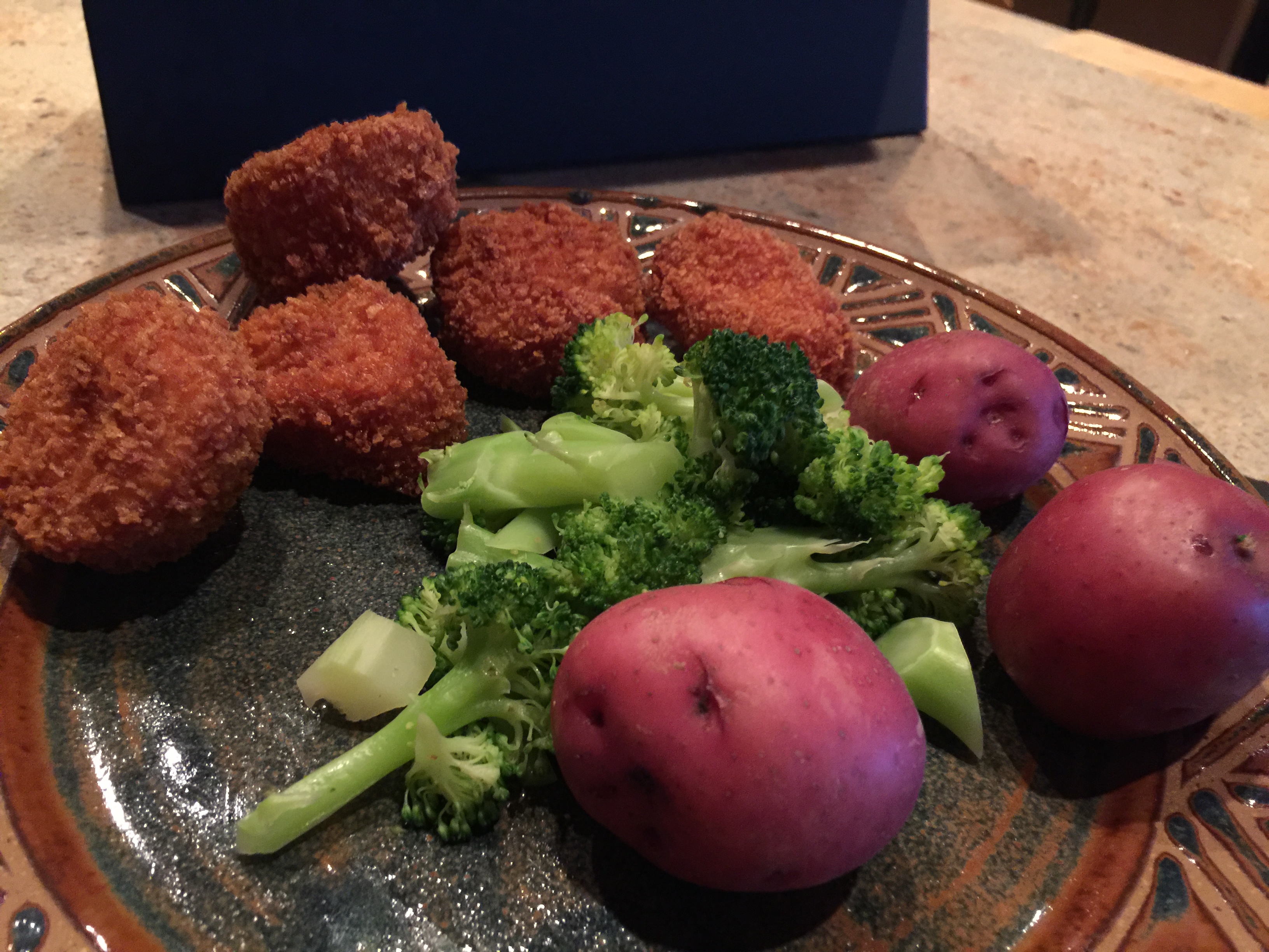 John fried the scallops after coating them with seasoned panko breadcrumbs and fried them outside in our electric wok. I know fried food is taboo but we don’t do this often and scallops are a very low calorie protein. I steamed new potatoes and broccoli and mixed up some Fish Market tartar sauce.