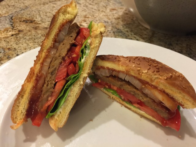 We had friends over for lunch today and I served Autumn Soup (again!) and a Caprese salad with burrata rather than mozzarella and pound cake with strawberries. Since that is about 10 times more than I usually have for lunch I went with a small dinner of a veggie burger with lettuce and tomato. Huh, just realized it was a vegetarian day!