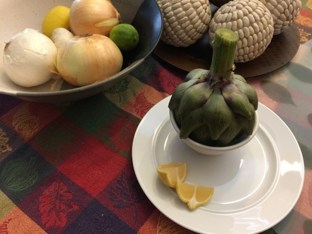 I wrapped this artichoke in plastic wrap and put it in the microwave for 5 minutes (maybe 4.5 minutes would have been better) and then I let it sit on the counter for an equal amount of time still in its plastic wrap. I ate it with some lemon, salt, and faux butter spray. You can eat the stem too after peeling the outer layer off. It tastes like the heart. BTW an easy way to attack the choke is with a grapefruit spoon with a serrated edge.