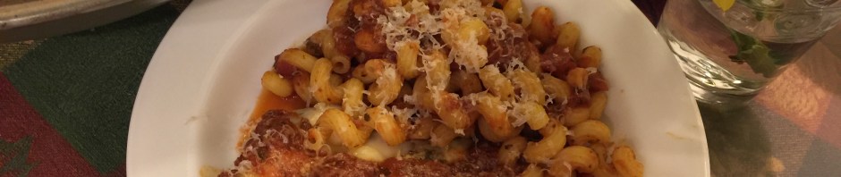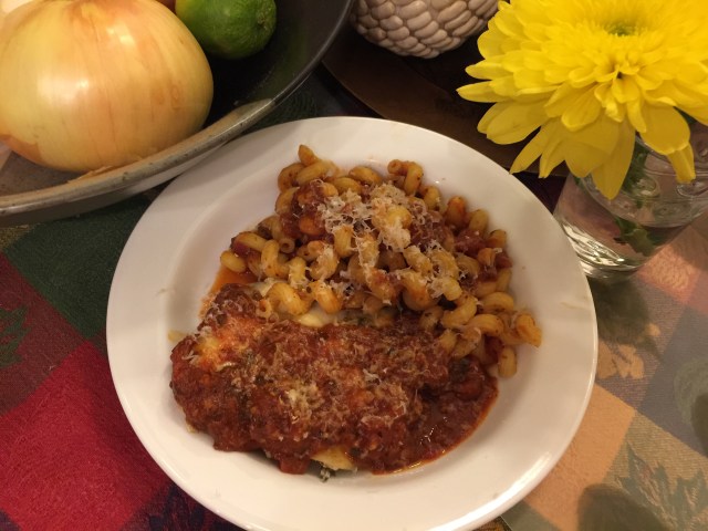 Hiding beneath the tomato sauce in the foreground is half of boneless, skinless chicken breast and a super slim slice of cheese. John sous vide the chicken and I made the sauce. I like making interesting forms of pasta. This is 2oz. of cellentani, a corkscrew kind of pasta. This is so much more exciting then our usual chicken, vegetable, starch!